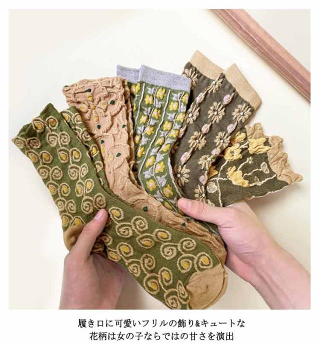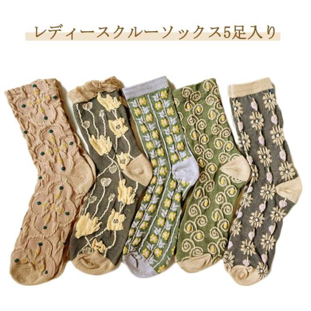 秋 ソックス 5足入り おしゃれ 花柄 コットンソックス 立体柄 靴下 クルーソックス レディース レトロ くつした コットンソックス 春 冬 クルーソックス 花柄靴下 ストレッチ