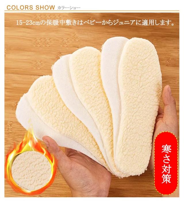 | 3足セット 暖かで一枚あればとっても便利なボア素材のインソール 15-23cmの保暖中敷きはベビーからジュニアに適用します。 厚さは5mmがあって、足から発する熱をロックします。 密度しっかりのシープボアでもこもことして保温性が高い。 吸湿・通気性があり、汗を素早く吸収し発散、臭いを防ぎ衛生的です。 レインブーツブーツやスニーカーの中敷きとしては、ふかふかの履き心地! | |