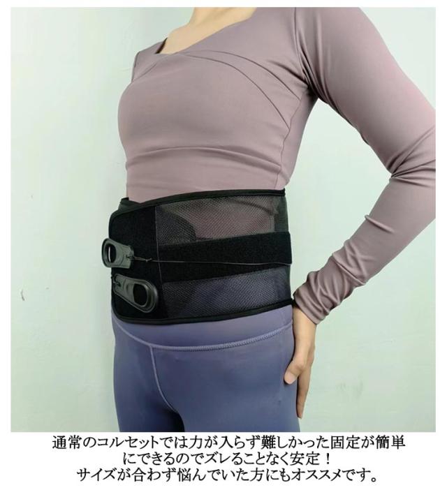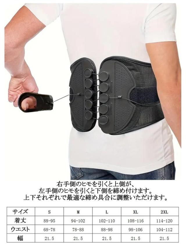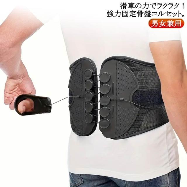 | 滑車の力でラクラク!強力固定 骨盤コルセット。 軽い力で引っ張るだけ!滑車滑車の原理で軽い力でもしっかり引き締め固定します。 通常のコルセットでは力が入らず難しかった固定が簡単にできるのでズレることなく安定!サイズが合わず悩んでいた方にもオススメです。 着脱カンタン!着脱の難しいホックはなし!強力なマジックテープ仕様なので、簡単にしっかりと固定できます。 いつでも気軽に着用!腰痛が気になる方、腰に負担がある作業をする方、産後の骨盤ケアに、家事や仕事をしながら体型改善! 右手側のヒモを引くと上側が、左手側のヒモを引くと下側を締め付けます。上下それぞれで最適な締め具合に調整いただけます。 幅広タイプなので腰から骨盤まで広範囲をサポートします。 メッシュ素材で通気性バツグン。蒸れないから夏場でも快適にお使いいただけます。 | |