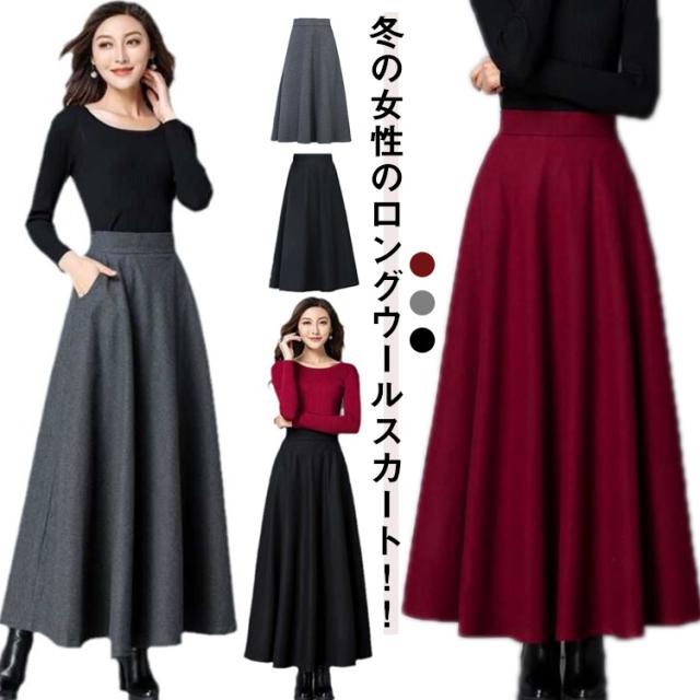 フレアスカート ウール調 黒 ポケット付き ハイウエスト 体型カバー ウエスト ウールタッチ スカート ロング 伸ばす マキシスカート 大人 スカート 大きいサイズ レディース ロングスカート Aライン 冬 フェイクウール 無地 着痩せ フレアスカート きれいめ