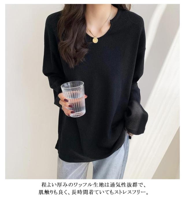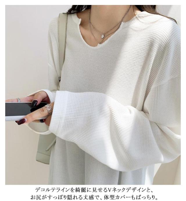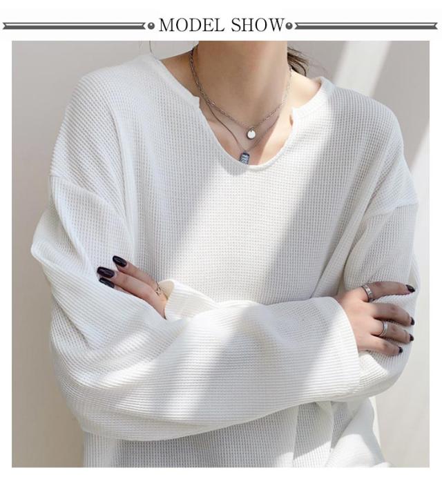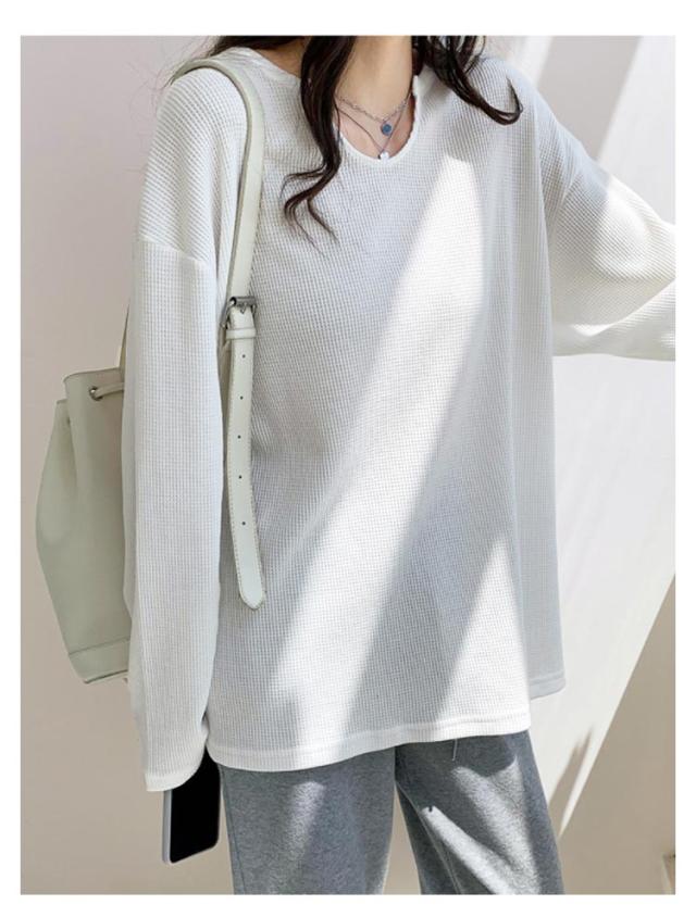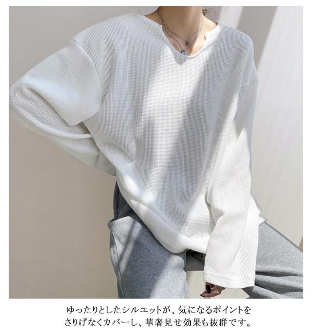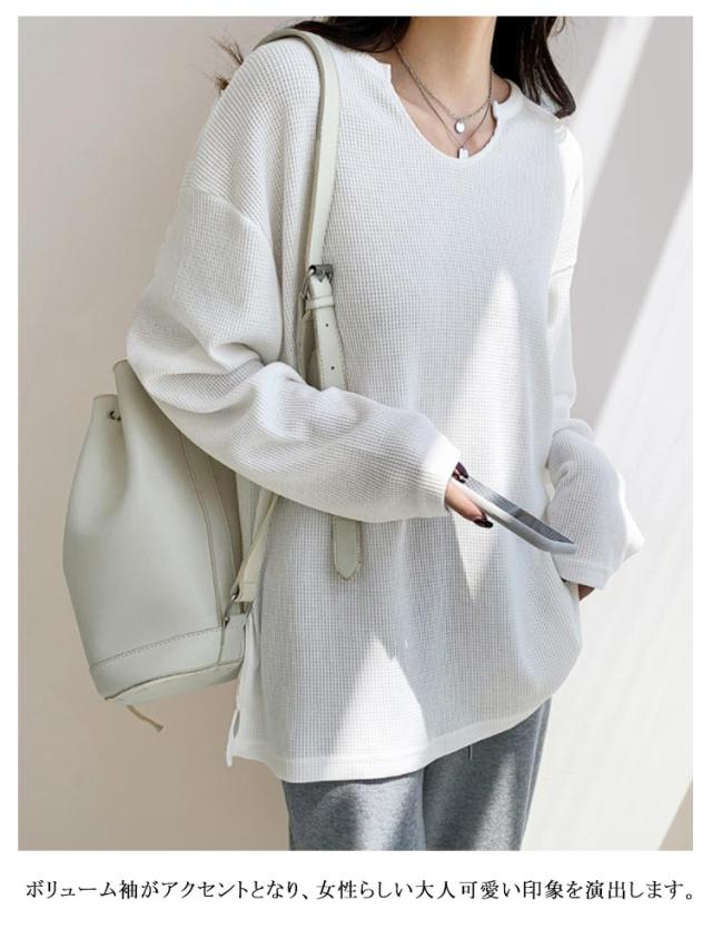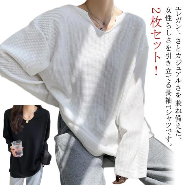 Tシャツ 2枚セット 2枚セット 無地 ワッフル レディース Vネック 長袖tシャツ トップス オーバーサイズ 着痩せ シンプル ゆったり ワッフル生地 ロンT 体型カバー ボリューム袖 カジュアル 春 秋 秋服 冬服