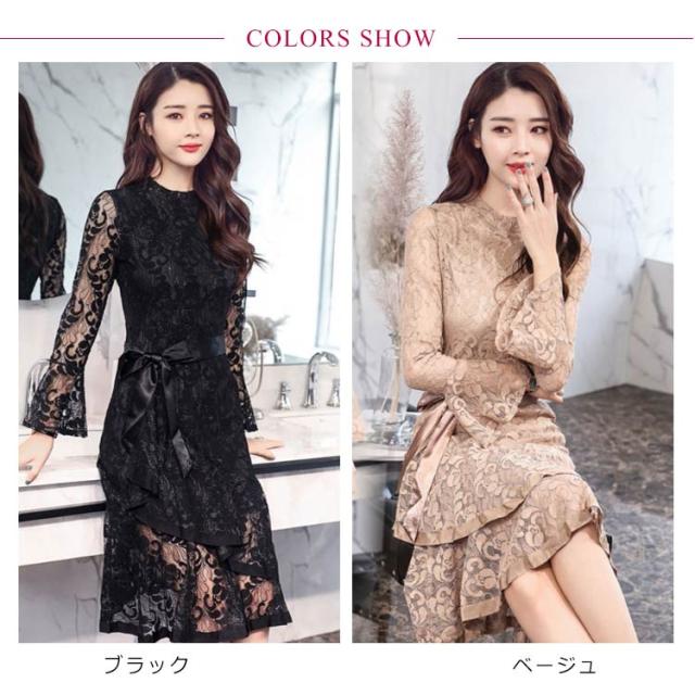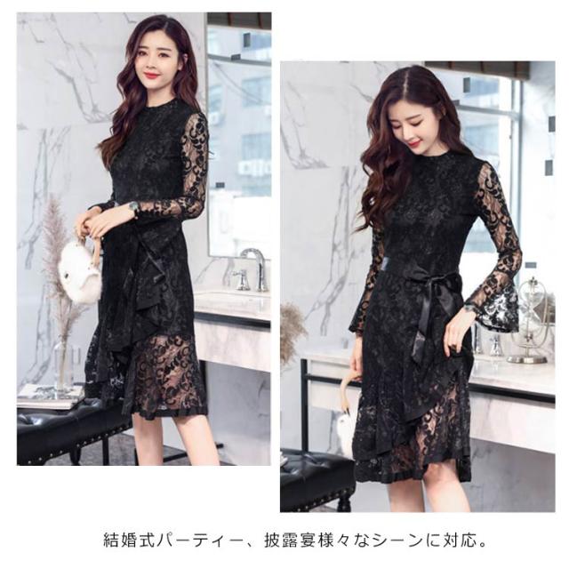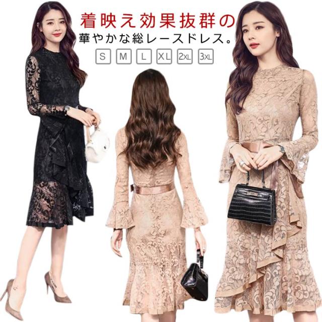 演奏会 大きいサイズ ドレス ワンピース 結婚式 膝丈 総レース マーメイドワンピース 二次会 レースワンピース 総レース エレガント フォーマル 謝恩会 同窓会 成人式 アシンメトリー裾 袖あり パーティードレス S M L XL 2XL