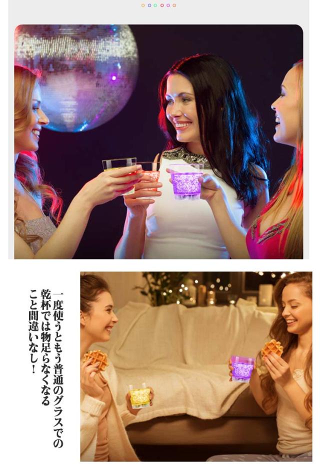 | ウイスキーを注ぐと光るロックグラス!【4個セット】【電池交換可能】【繰り返し使用可能】 センサータイプのこのグラスは、ドリンクを注ぐと光り出します! お酒を注ぐと気泡がLEDの光で美しく輝きます! バランスのとれた美しいデザイン!結婚式・クラブパーティー・ホームパーティーと使うシーンを選びません! パーティー・イベントを新しい光りの演出で盛り上げちゃってください♪ 一度使うともう普通のグラスでの乾杯では物足らなくなること間違いなし! パーティーやイベントの盛り上げアイテムとして大人気のセット商品です! 水洗いで繰り返し使用可能。 | |