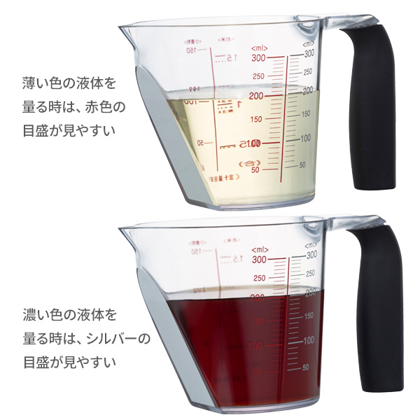 目盛が2色(赤とシルバー)だから、量る液体が薄い色でも濃い色でも見える!