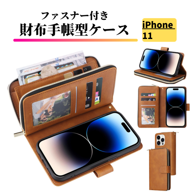 iPhone 11 ケース 手帳型 レザー お財布 シンプル カードケース 軽量 カード収納 スタンド ストラップ付 耐衝撃 スマホケース カバー アイフォン iPhone 11 ブラウン