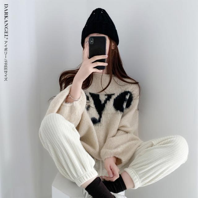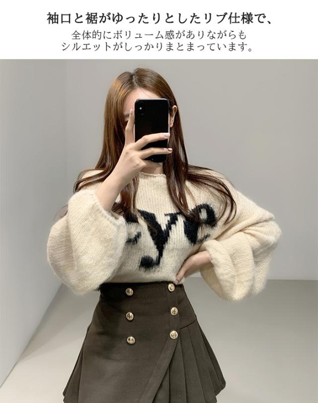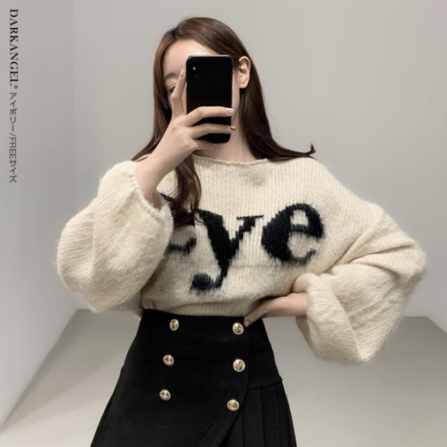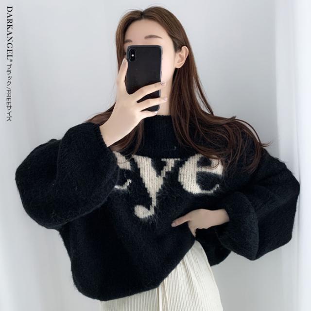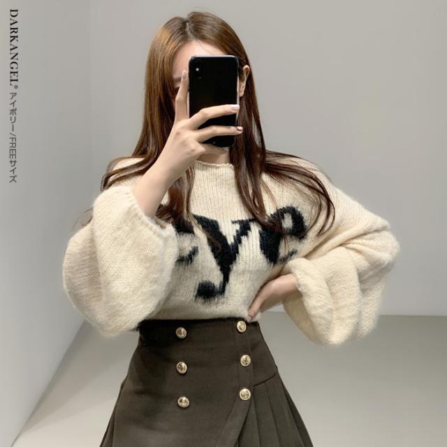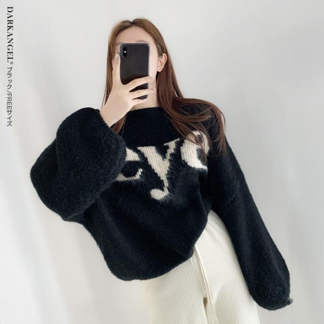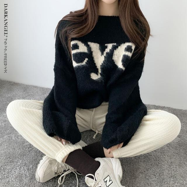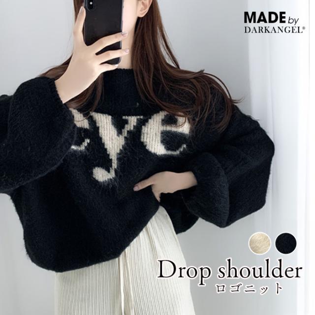 33%OFFクーポン!トップス ニット ニットセーター レディース 秋 冬 ボリューム袖 長袖 ゆったり ラウンドネック カジュアル 体型カバー ドロップショルダー ブラック 【ドロップショルダーロゴニット】 ダークエンジェル 春新作 ●即納●