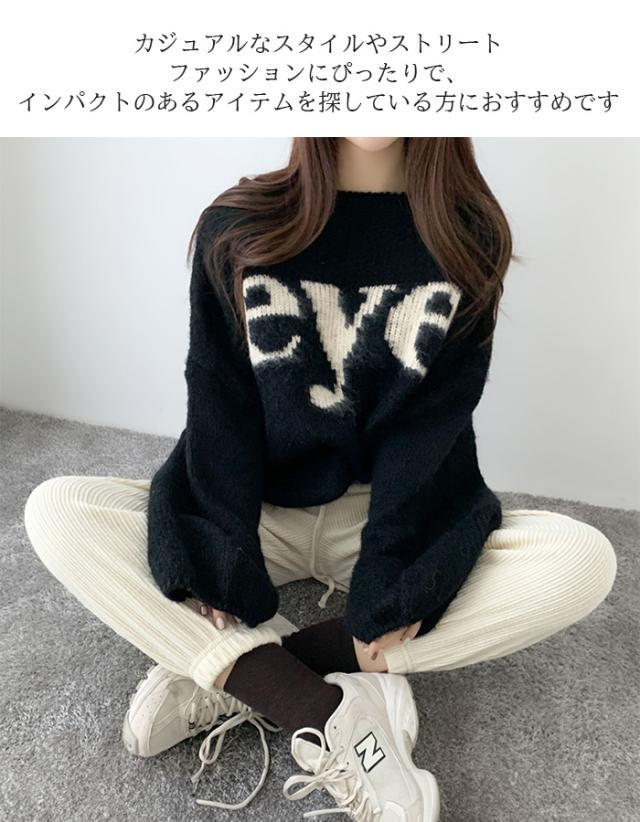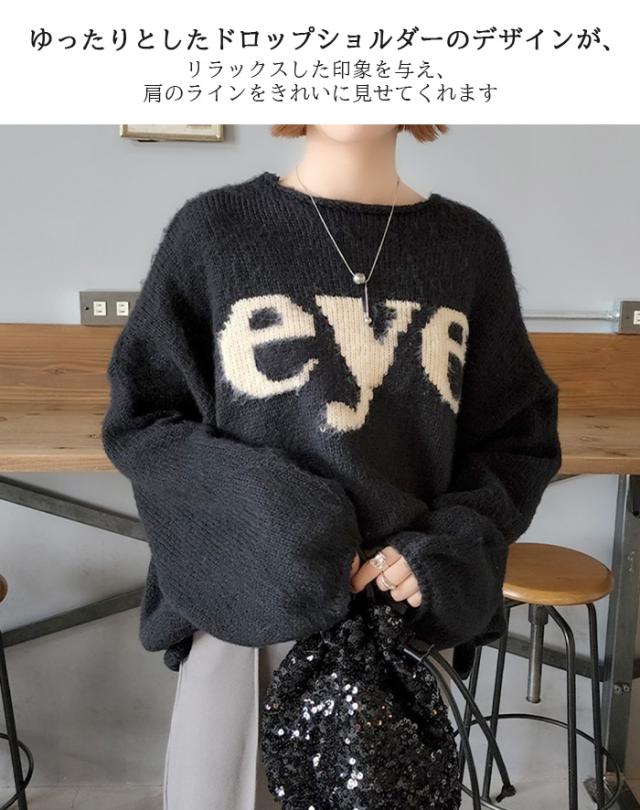 【 ドロップショルダーロゴニット】 ロゴの「eye」デザインはインパクトがあり、 シンプルなデザインながらも視覚的に目を引くポイントです。 大きめのシルエットがトレンド感を演出し、 こなれた雰囲気を簡単に作り出せます。 |