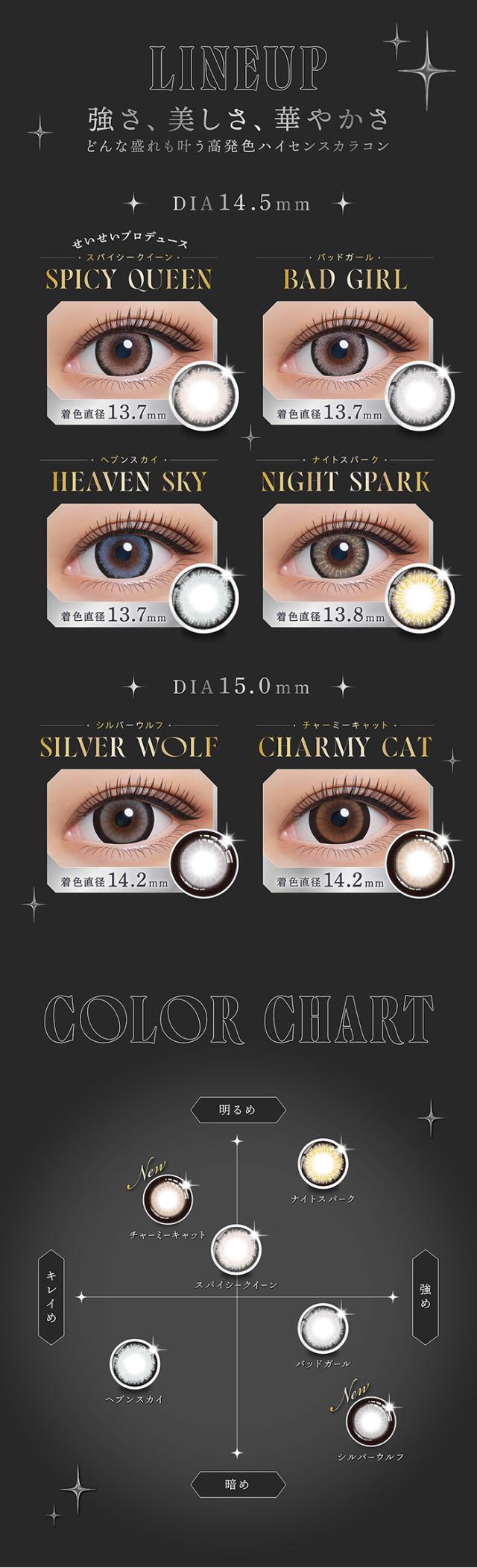 | DIA | 14.5mm:スパイシークイーン/バッドガール/ヘブンスカイ/ナイトスパーク 15.0mm:シルバーウルフ/チャーミーキャット |