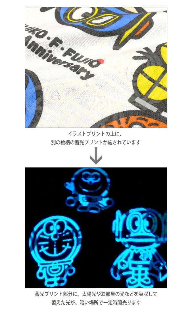 蓄光プリント部分に、太陽光やお部屋の光などを吸収して蓄えた光が、暗い場所で一定時間光ります。お着替えを嫌がったりまだ寝たくないお子様、電気を消すのや一人で寝るのが苦手なお子様のおやすみを応援するパジャマです。