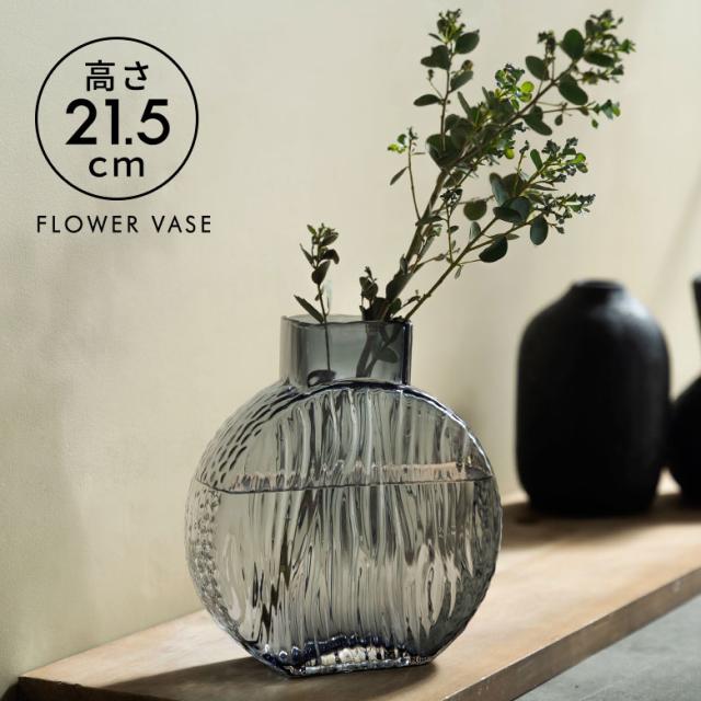 フラワーベース ガラス クリアグレー グレー ラウンド 大きい 大型 高い 高さ 21.5cm 開口部7.5cm フラット ボトル型 約 W20 × D7 × H21.5 cm 花瓶 花びん 花器 ガラスベース ガラス花びん 生花 ドライフラワー おしゃれ 北欧[67107]