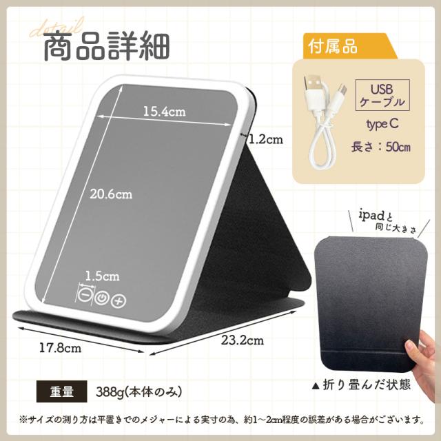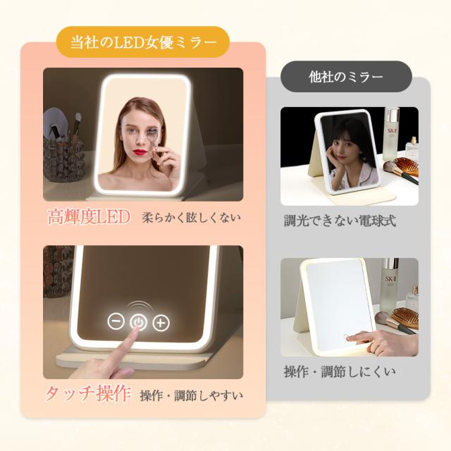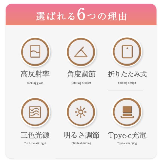 折りたたみ式 LED女優ミラー 大きいサイズ<当社のLED女優ミラー>・高輝度LED 柔らかく眩しくない・タッチ操作 操作・調節しやすい選ばれる6つの理由1.高反射率2.角度調節3.折りたたみ式4.三色光源5.明るさ調節6.Tpye-c充電