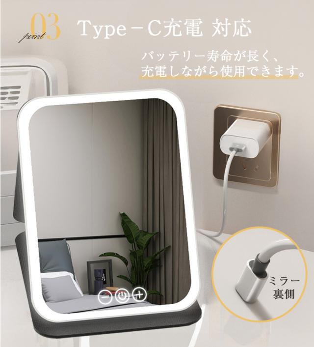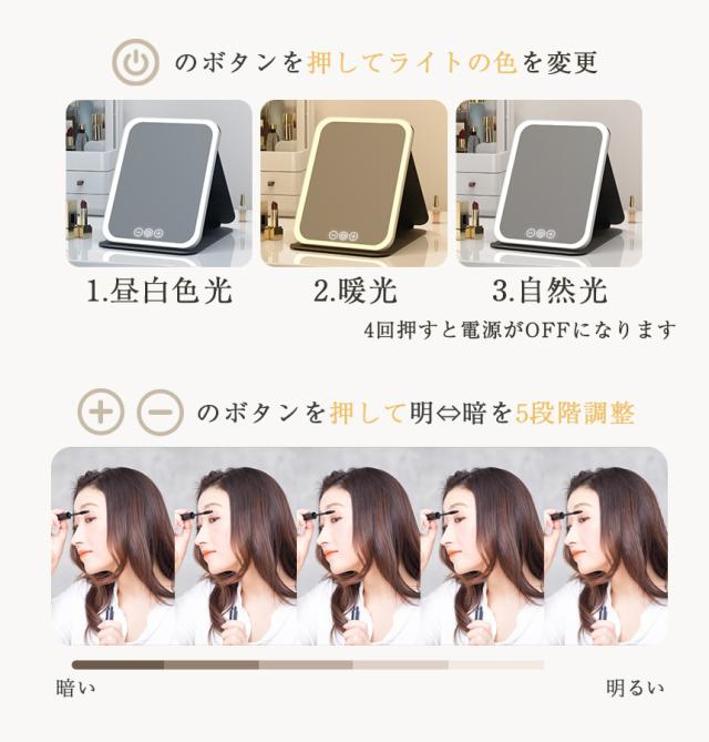 女優ミラー 日光女優ミラー 卓上ミラー 化粧鏡 卓上 鏡 ライトミラー LEDミラー メイクミラー ライト付きミラー USBサポート式 携帯型ミラー 折り畳み式 三色光源 ミラー 折りたたみ式 折りたたみ USB Type-C ブラック ホワイト ピンク 明るさ調節 タッチボタン LED