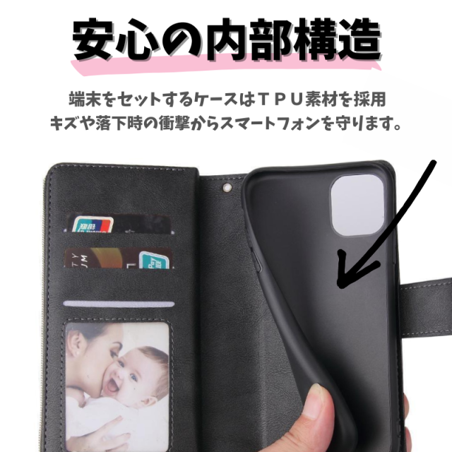 外部は上質なPUレザーを採用し、 ふわふわな質感で、手にしっかりフィット。 内部は柔らかいTPU材質を採用し、本体への衝撃を緩和させる仕様で、キズや衝撃から大切な携帯をしっかり保護