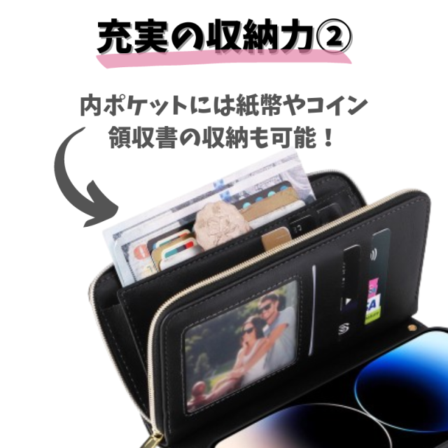 お財布としての機能もあり、収納ポケットには折りたたみ紙幣を入れることができ、コインケース 、キーケース 、 領収書入れ としても利用可能。さらに全体を収納できるファスナー付きなので、大切なものを落とす心配もなく、安心して持ち運び可能です。