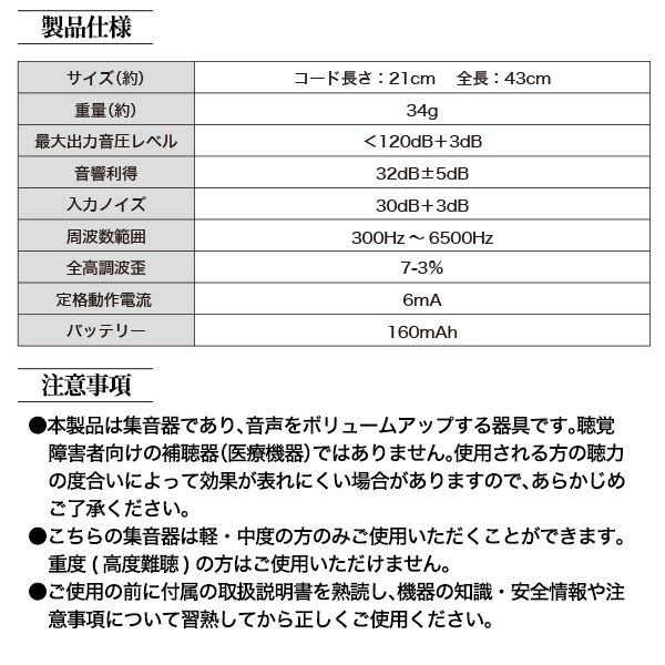 ●本製品は集音器であり、音声をボリュームアップする器具です。聴覚障害者向けの補聴器(医療機器)ではありません。使用される方の聴力の度合いによって効果が表れにくい場合がありますので、あらかじめご了承ください。