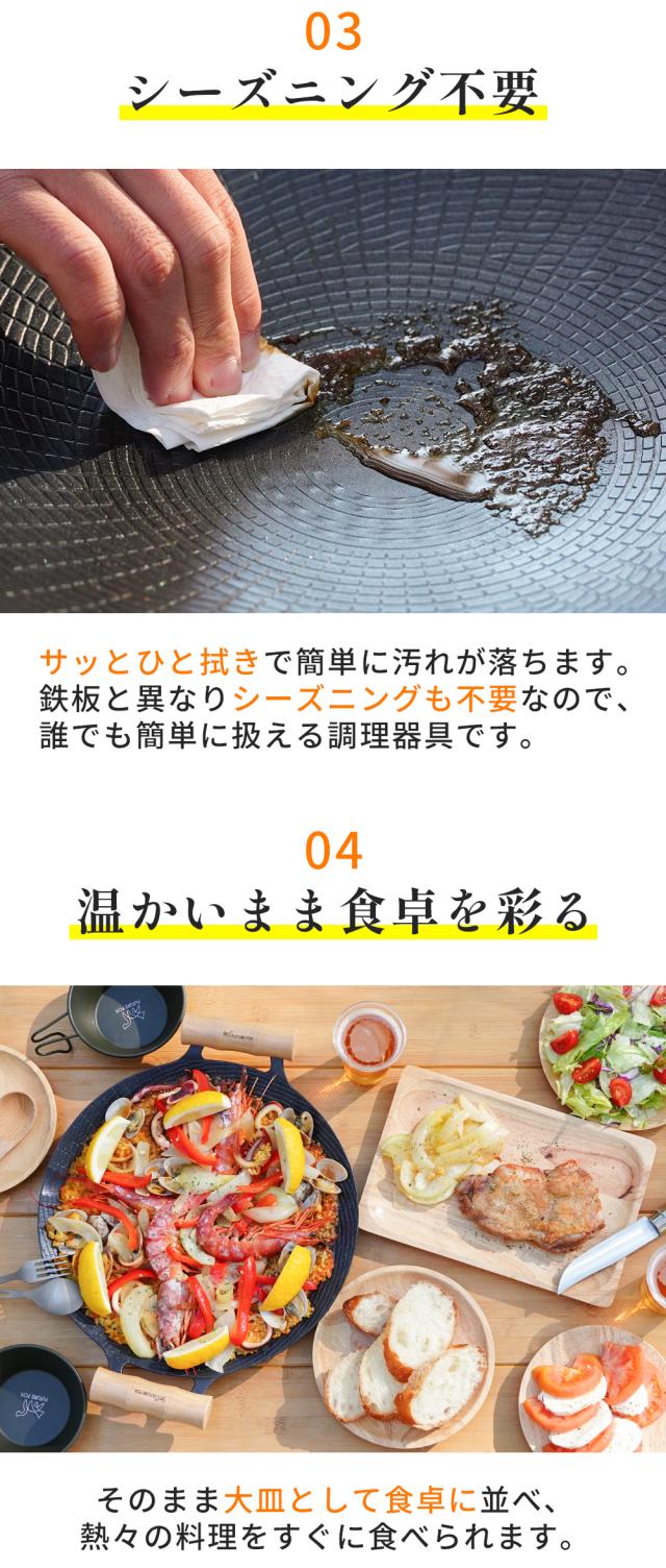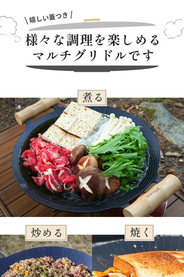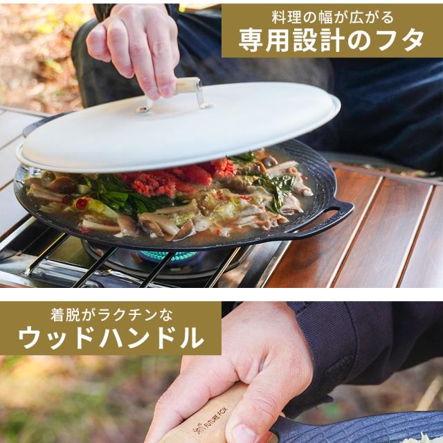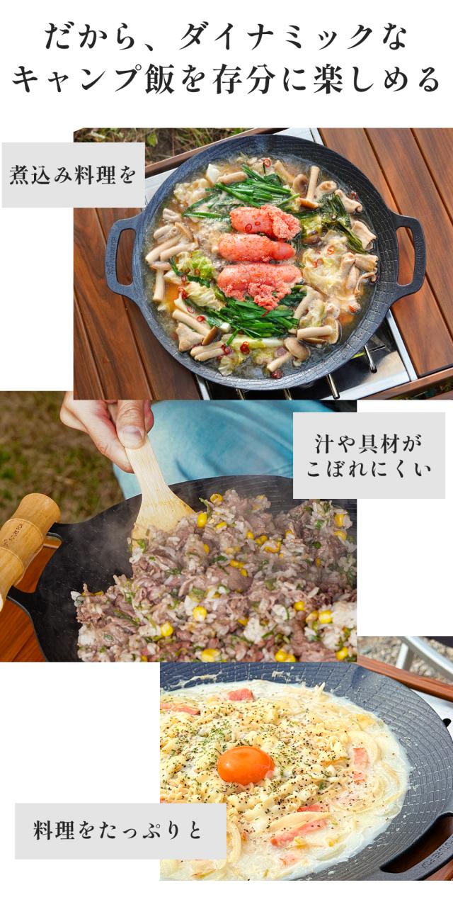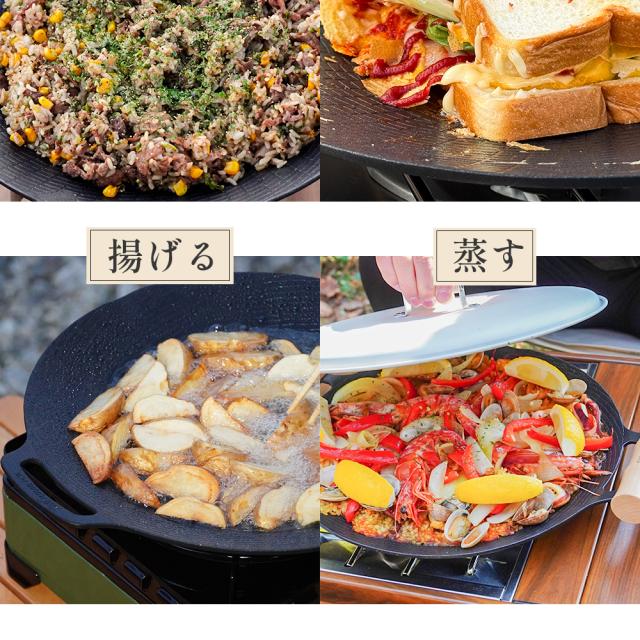 専用のフタ付きで蒸す工程も快適に、油はねも防げます。直火、ガス、IHに対応し、アウトドアや家庭で幅広い調理が可能です。