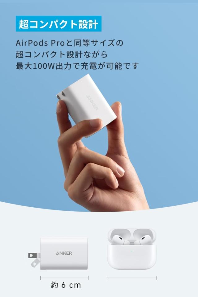 AirPods Proと同じサイズの超コンパクト設計ながら、最大100W出力で充電が可能です。