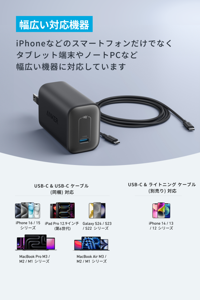 USB PD対応のUSB-Cポートを搭載し、MacBook Pro等のノートPCからタブレット端末、iPhone 15シリーズやGalaxy S24シリーズ等のスマートフォンまで充電することができます。