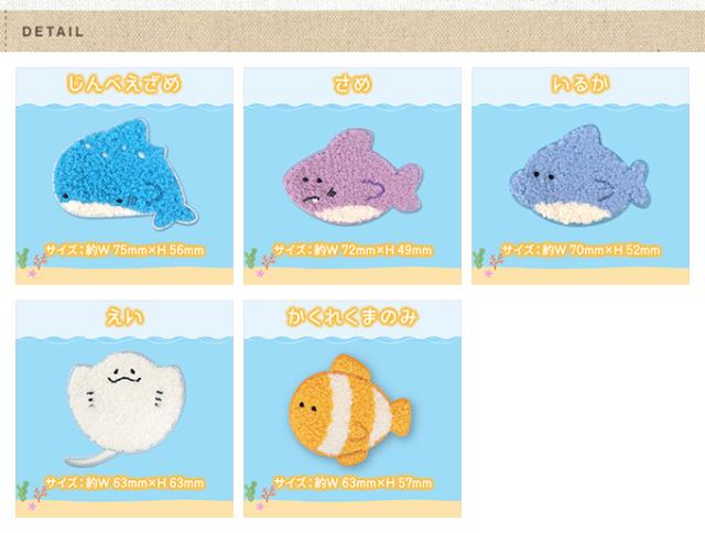 【じんべえざめ】約W 75mm×H 56mm 【さめ】約W 72mm×H 49mm 【いるか】約W 70mm×H 52mm 【えい】約W 63mm×H 63mm 【かくれくまのみ】約W 63mm×H 57mm |