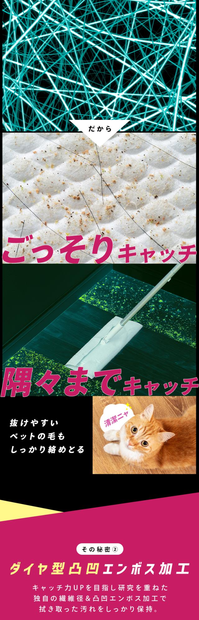 マイクロファイバーを用いた特殊ポリプロピレンシートだから、髪の毛・ホコリが吸い付くように拭き取れる。