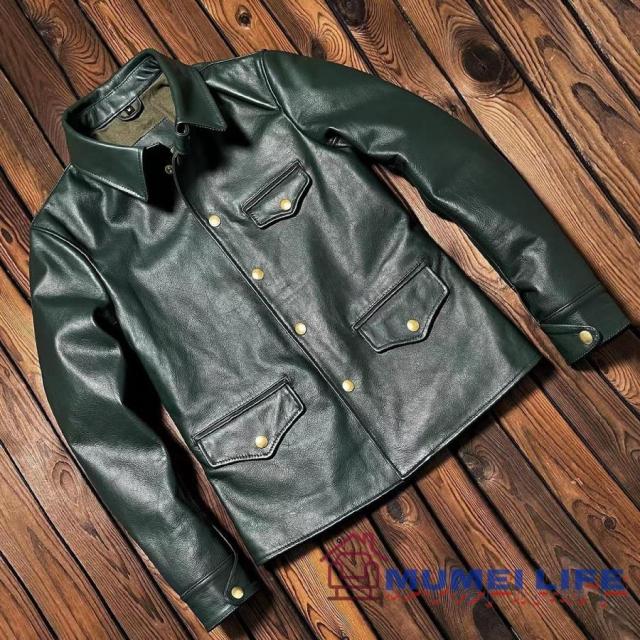 新品 復刻50's ドライビングコート レザージャケット グリーン カーコート ワークコート オイルワックスレザー 牛革