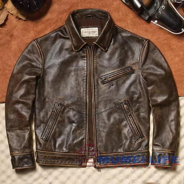 クラシック 頭層牛革レザージャケット レトロ アンティーク加工 本革 スリムフィット ショート丈 メンズジャケット、