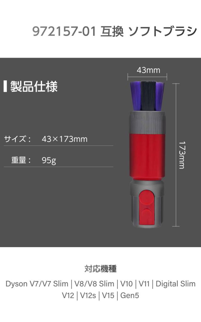 | 商品特徴 | 【対応機種】 972157-01互換互換 V7 V8 V10 V11 V12 V15 Gen5シリーズにご使用いただけます。 ・Dyson V7/V7 Slim ・Dyson V8/V8 Slim ・Dyson Cyclone V10 ・Dyson V11 ・Dyson V12 Detectslim ・Dyson Digital Slim ・Dyson V15 Detect 。Dyson Gen5 【傷つきやすい表面をやさしくクリーニング】 数千本の極細毛が表面を優しく掃除します。 【セルフクリーニング機能】 先端が回転することによりブラシについたほこり、ゴミなどをセルフクリーニング。 いつでも清潔な状態を保ちます。 【ご使用場所例】 ・キーボードなどの精密機器の隙間 ・カーナビ、テレビなどのディスプレイ ・窓のサッシなどの細かい溝 ・繊細なインテリア 【パッケージ内容】 ソフトブラシ×1 (V7 V8 V10 V11 V12 V15 Gen5対応) 【アフターサービス】 厳格な品質検査を複数回実施し、品質には万全を期しています。 万が一の不良品による返品・交換も迅速に対応いたしますので、ご連絡ください。 |
