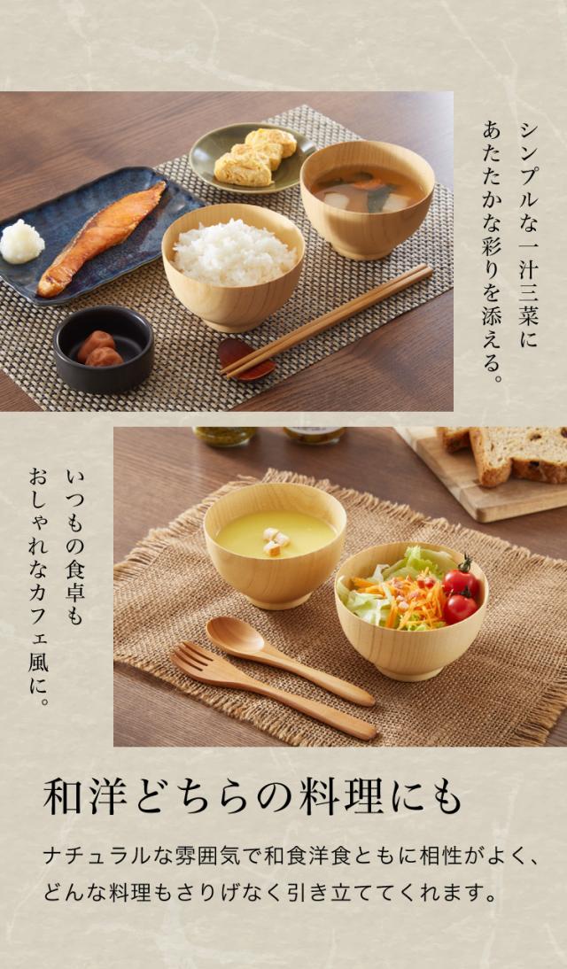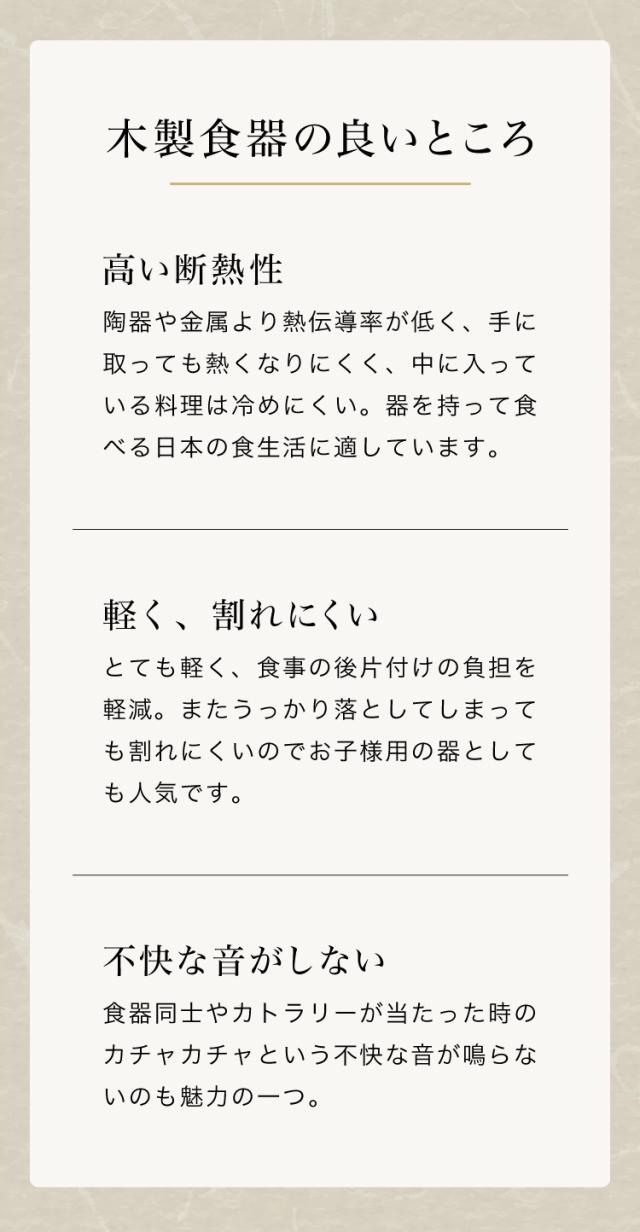 木製のナチュラルな質感・さわり心地をはそのままに、利便性を高めたお椀です。