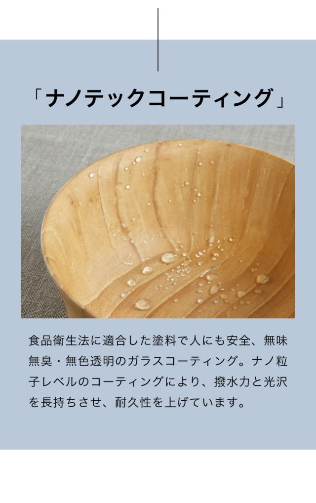 従来の木製漆器は食洗機の使用はできませんでしたが、「ナノテックコーティング」という特殊加工を施すことで食洗機対応となっています。