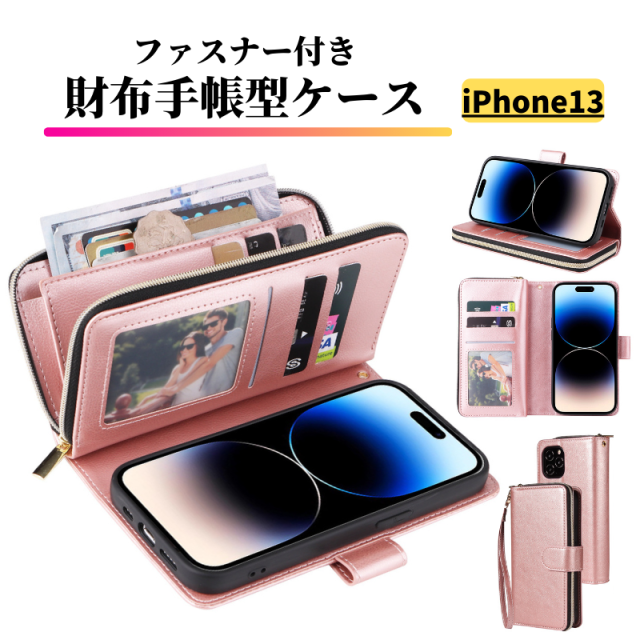 iPhone 13 ケース 手帳型 レザー お財布 シンプル カードケース 軽量 カード収納 スタンド ストラップ付 耐衝撃 スマホケース カバー アイフォン iPhone13 ピンク
