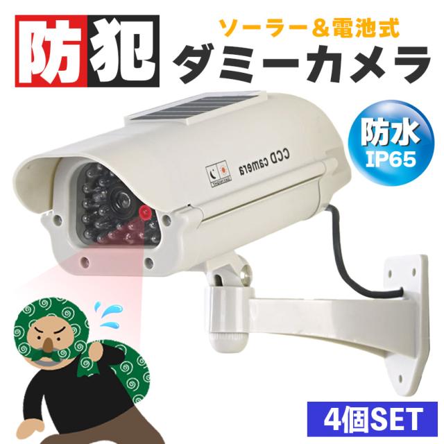 ダミーカメラ 防犯 4個セット 防犯グッズ 屋内 屋外 監視カメラ ダミー 防犯カメラ 偽物 偽 ソーラーパネル 電池式 ソーラー 防水 セキュリティ 壁付け ランプ 点滅 空き巣 泥棒 家 お店 マンション アパート 犯罪 防止 壁 玄関 セキュリティー 闇バイト 侵入防止 白 ホワイト