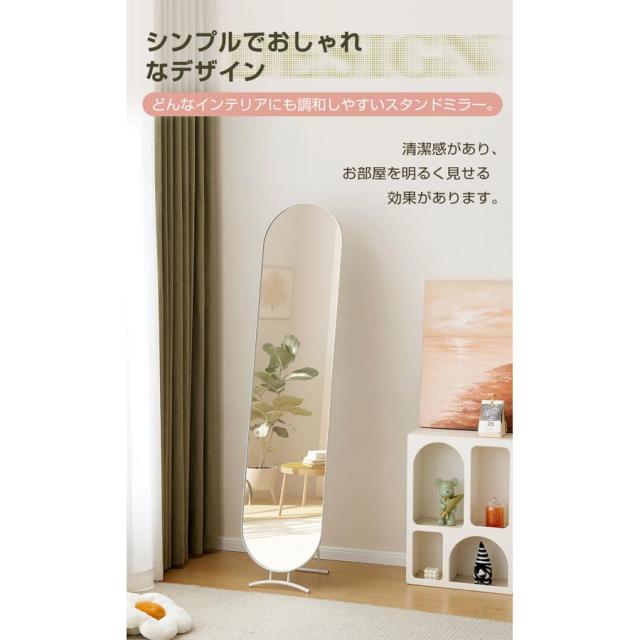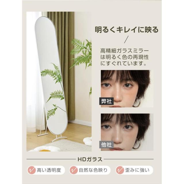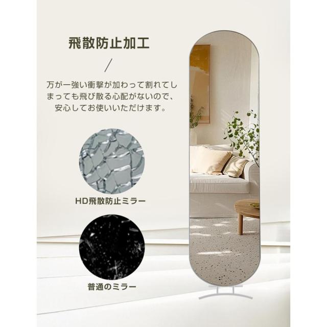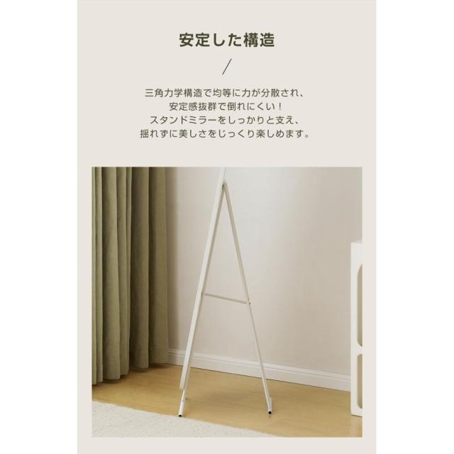 【シンプルでおしゃれなデザイン】どんなインテリアにも調和しやすいスタンドミラー。 【安定した構造】三角力学構造で均等に力が分散され、スタンドミラーをしっかりと支え、揺れずに美しさをじっくり楽しめます。 安心な飛散防止加工・万が一破損してもガラスは飛び散りにくいです。