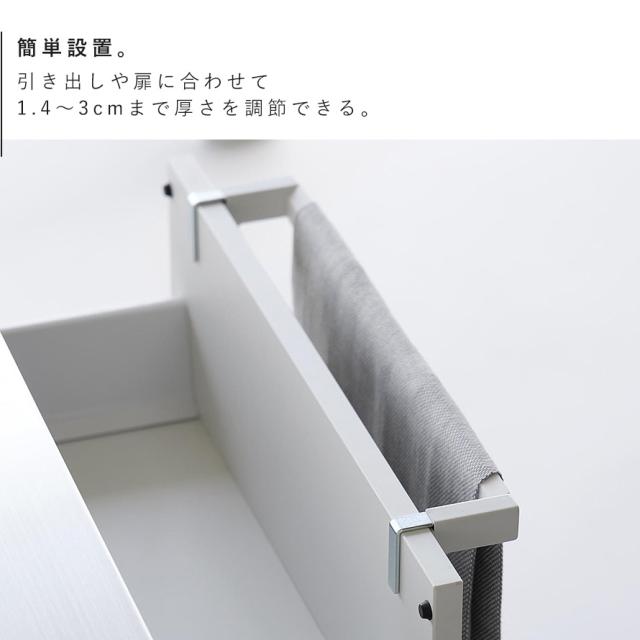 ■取り付け可能な引き出し・扉:幅/36cm以上(扉のハンドル等を含まず) 厚さ/1.4〜3cm以内 上部との隙間/0.3cm以上 ※本製品は屋内の一般的な平面の流し台や洗面台を対象にしています。※ガラス戸やキズつきやすい設置場所でのご使用はお避けください。※サイズや厚み、形状、材質によっては取り付けできない場合があります。