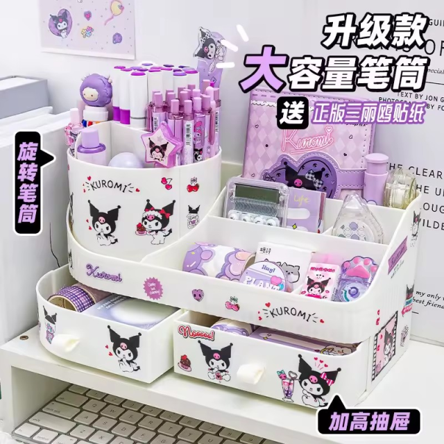 勉強道具棚 文房具収納ボックス 回転ペンホルダー 収納引き出しケース コンパートメント クロミちゃん マイメロディ シナモロール ポチャッコ サンリオ ハローキティ 大容量 収納ラック 男の子 女の子 小学生 中学生 高校生 女可愛い キュート ステッカー付