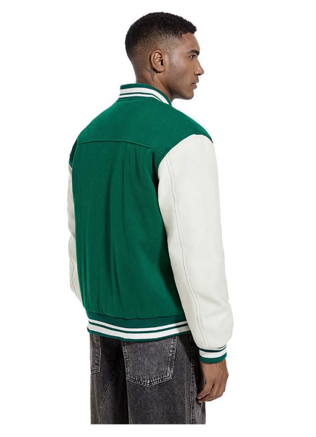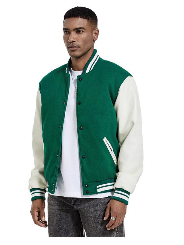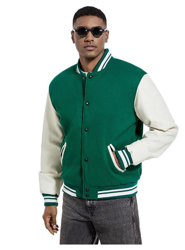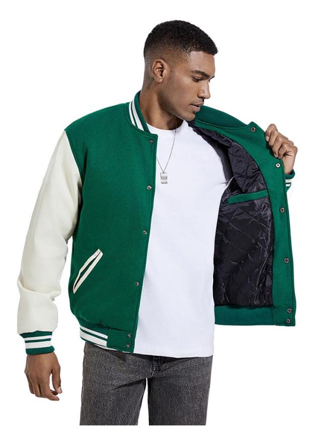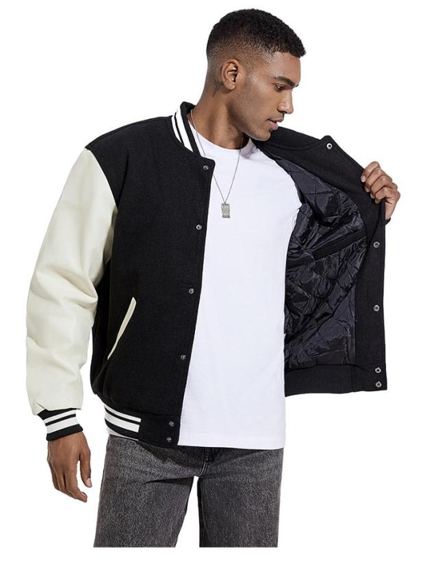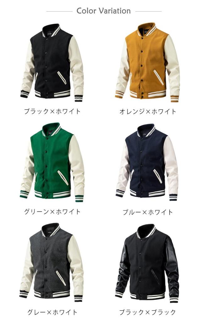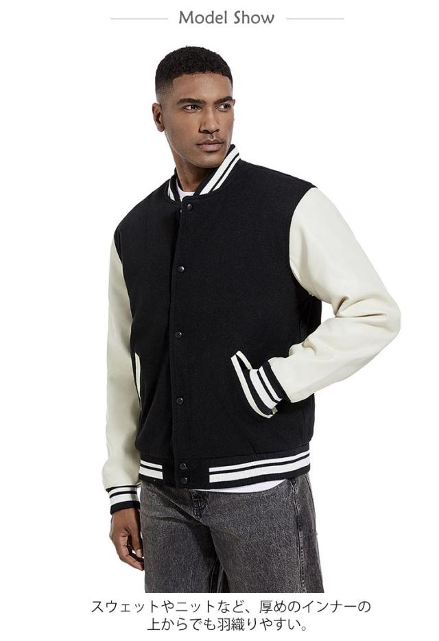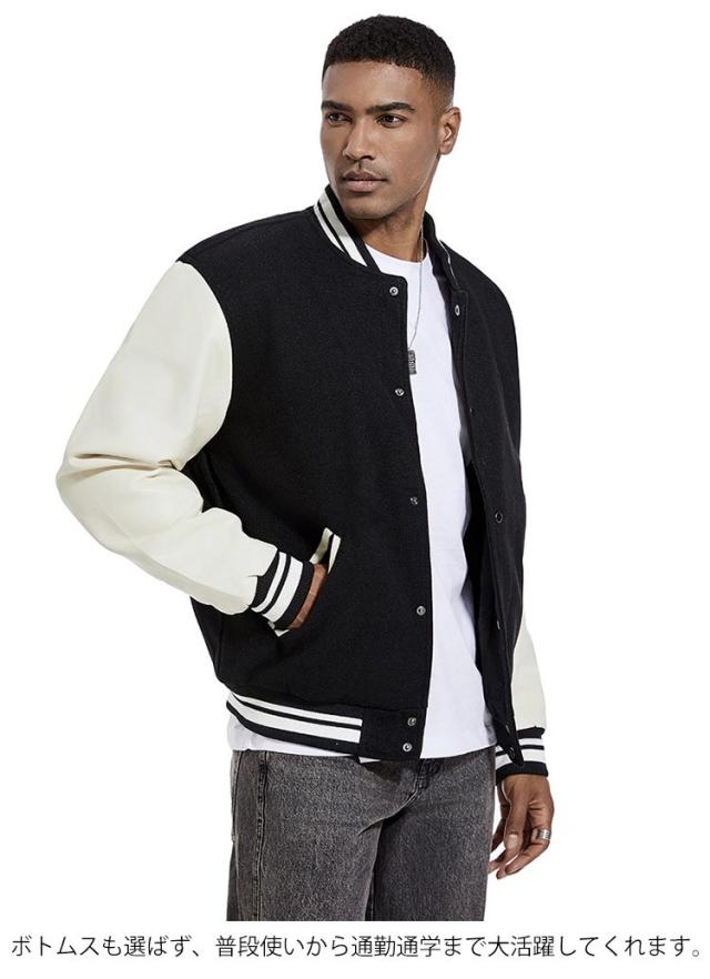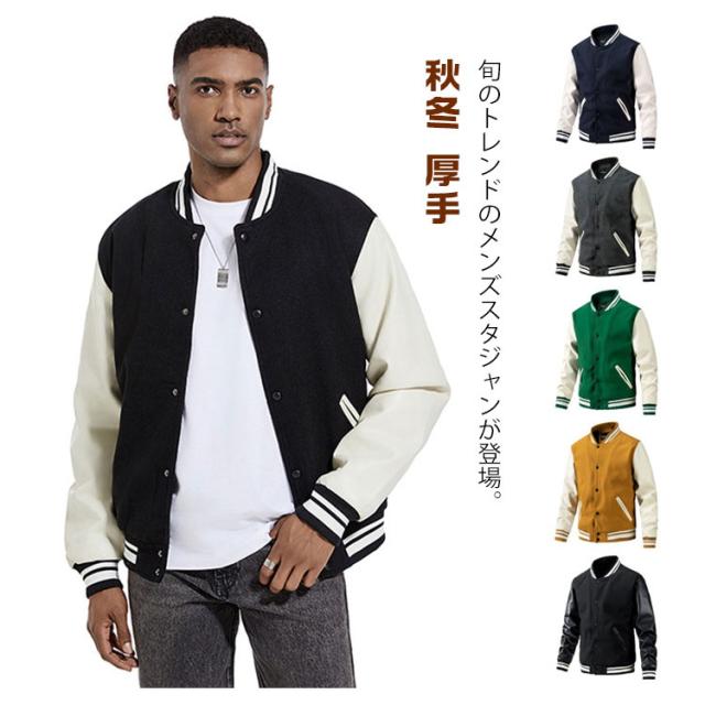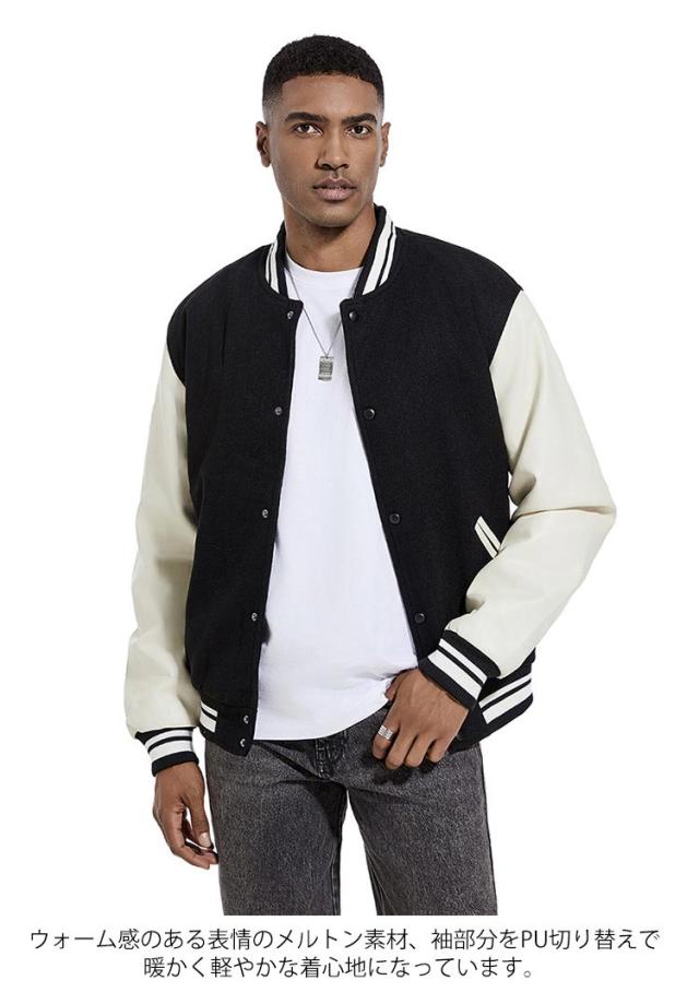 | 旬のトレンドのメンズスタジャンが登場。 スウェットやニットなど、厚めのインナーの上からでも羽織りやすい。 ウォーム感のある表情のメルトン素材、袖部分をPU切り替えで暖かく軽やかな着心地になっています。 裏部分は中綿入り、ステッチも丁寧にでディテールに拘りました。 ボトムスも選ばず、普段使いから通勤通学まで大活躍してくれます。 カラーバリエーションが豊富で着回しも簡単!色違いでほしくなります。 | |