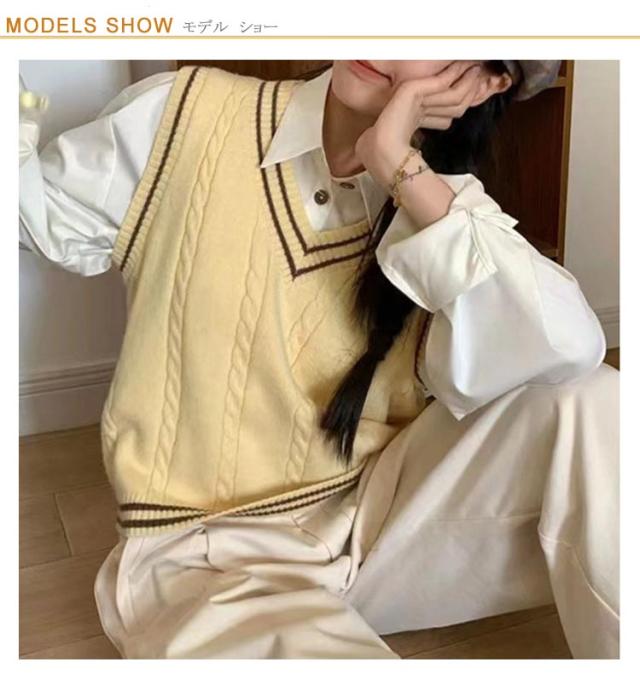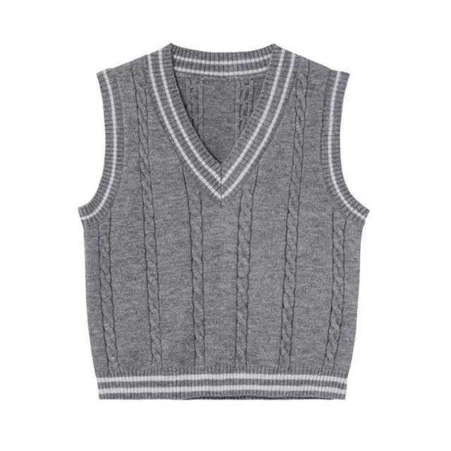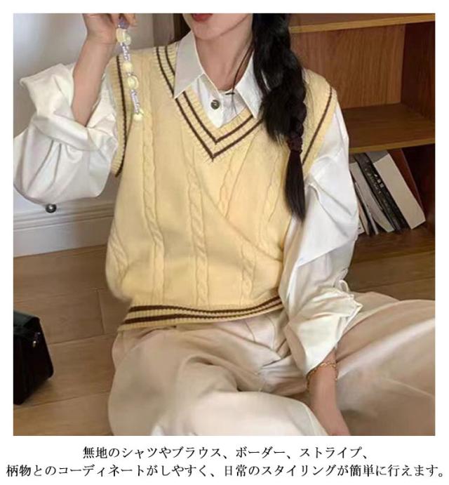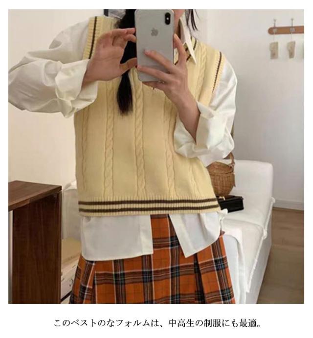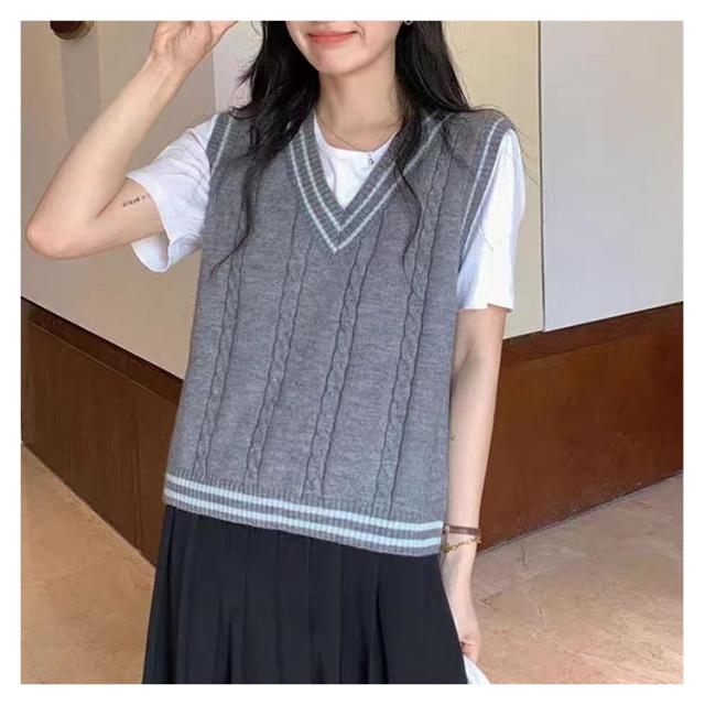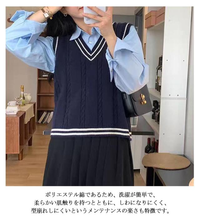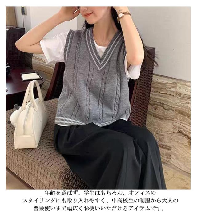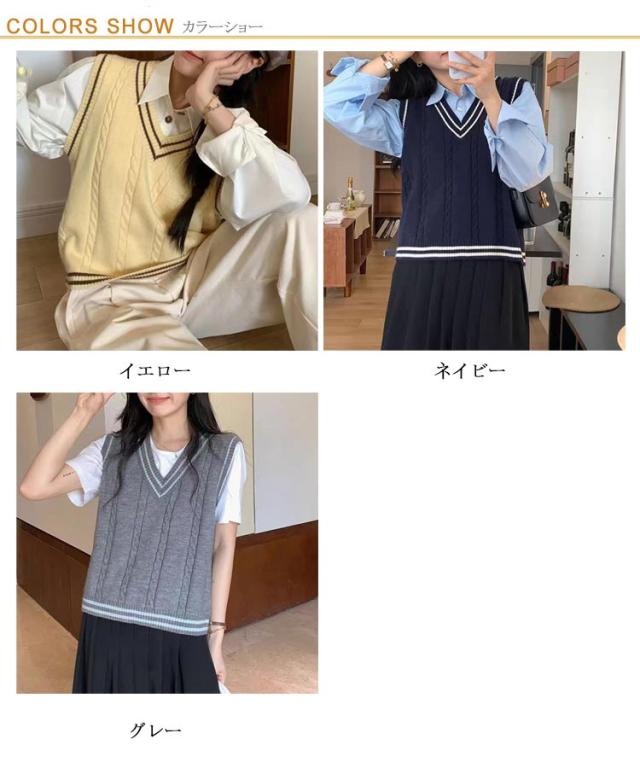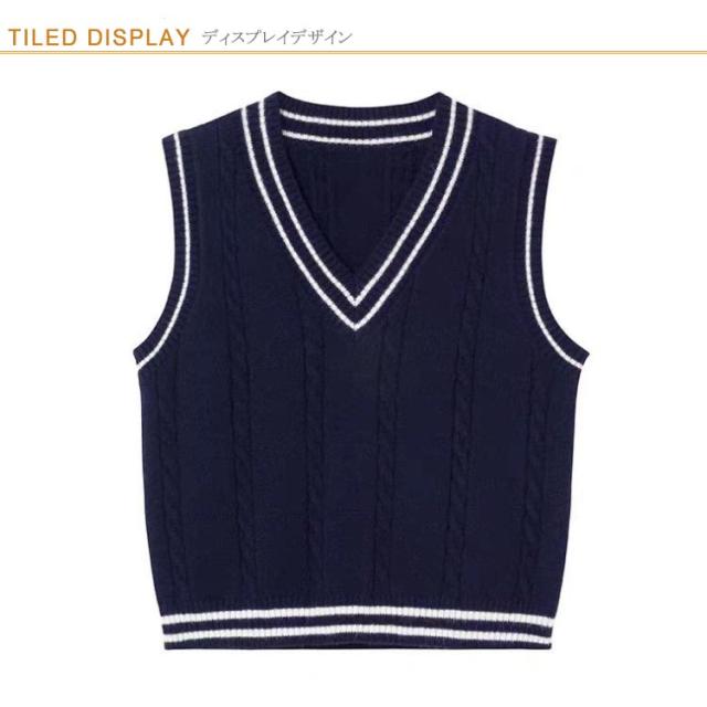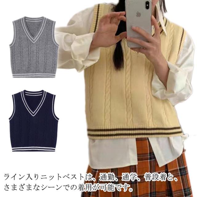 ニットベスト レディース ショート丈 vネック ライン入りニットベスト スクールベスト グレー ネイビー ケーブル編み Vネック ニットベスト レディース 春 レイヤード トップス セーター 制服 学生服 JK 女子高生 高校 中学 通学 学校 ニット