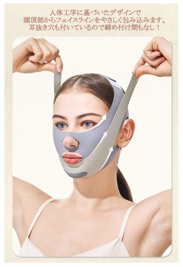 | 料理・家事・育児・読書をしながら装着するだけ! フェイスラインを引き締めるフェイスベルト。 マジックテープで引き締め度を調節でき、装着も取り外しもとても簡単! ストレッチ性が良くて、顔のツボを圧迫しない安心設計で、物理顔リフト、ほかの顔やせている方式より安全! 人体工学に基づいたデザインで頭頂部からフェイスラインをやさしく包み込みます。耳抜き穴も付いているので締め付け間もなし! フェイスラインのゆるみを解消して、若々しく見える!小顔になりたい人は是非お試し下さい。男女問わずお使い頂けます。 | |