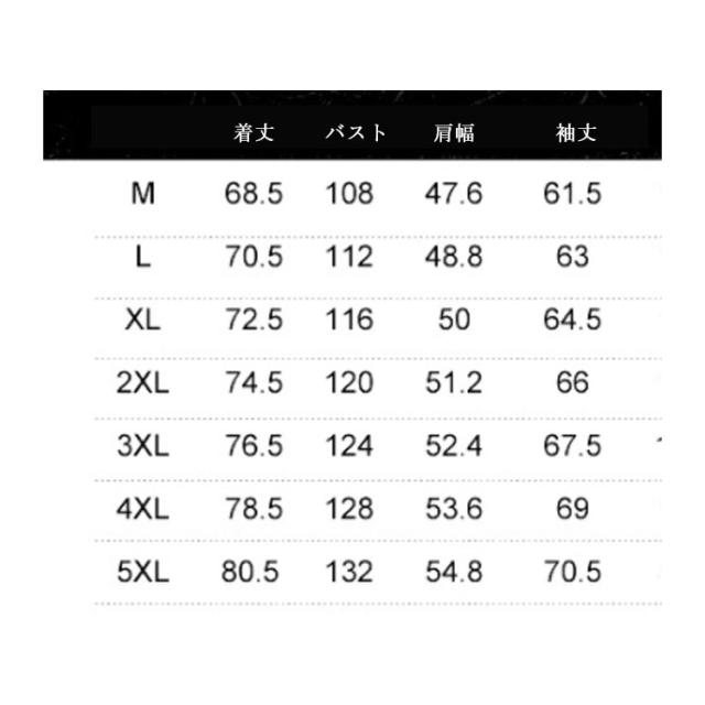 | サイズについての説明 | M L XL 2XL 3XL 4XL 5XL サイズ:写真通り ※上記サイズは平置き実寸になります。サイズ表の実寸法は商品によって1-3cm程度の誤差がある場合がございます。 |
