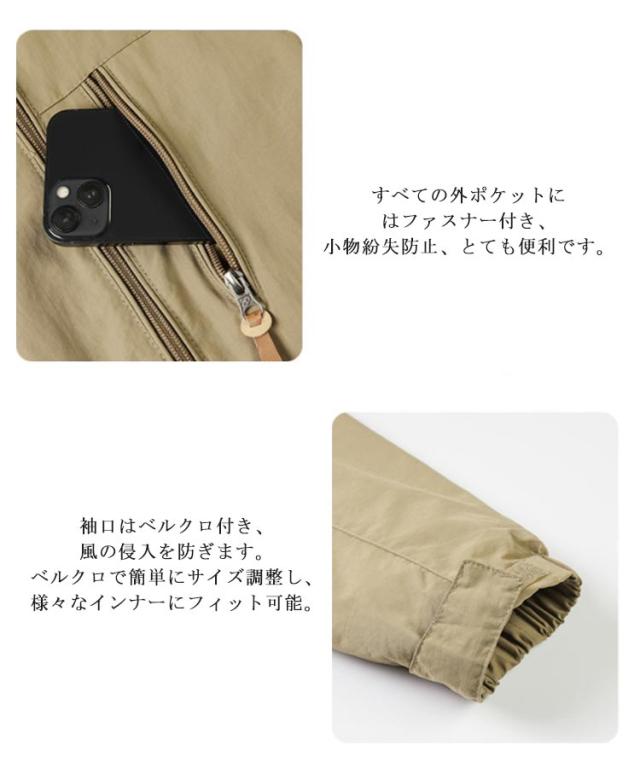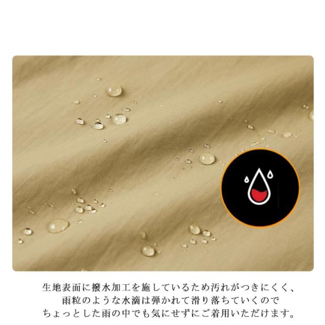 | はっ水 フード脱着式マウンテンパーカー 生地表面に撥水加工を施しているため汚れがつきにくく、雨粒のような水滴は弾かれて滑り落ちていくのでちょっとした雨の中でも気にせずにご着用いただけます。 着膨れせずにすっきりとしたシルエットでいつでも気軽に羽織れる万能なライトアウターに仕上げています。 すベての外ポケットにはファスナー付き、小物紛失防止、とても便利です。 袖口はベルクロ付き、風の侵入を防ぎます。ベルクロで簡単にサイズ調整し、様々なインナーにフィット可能。 | |