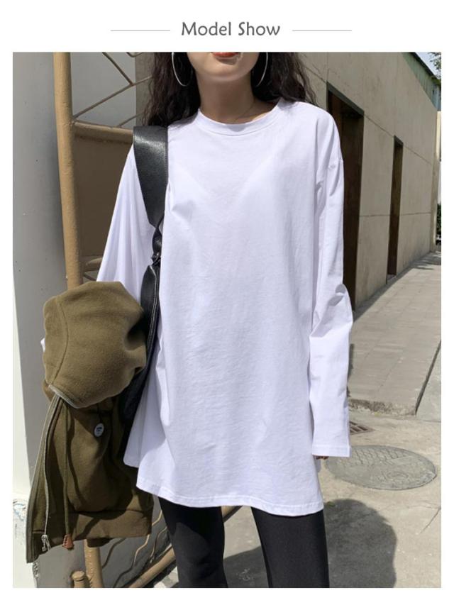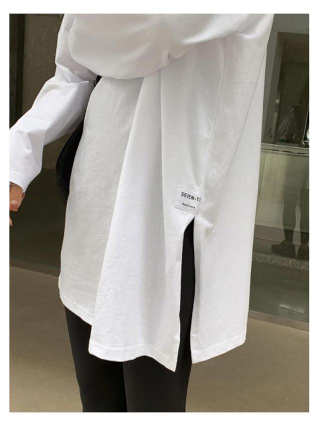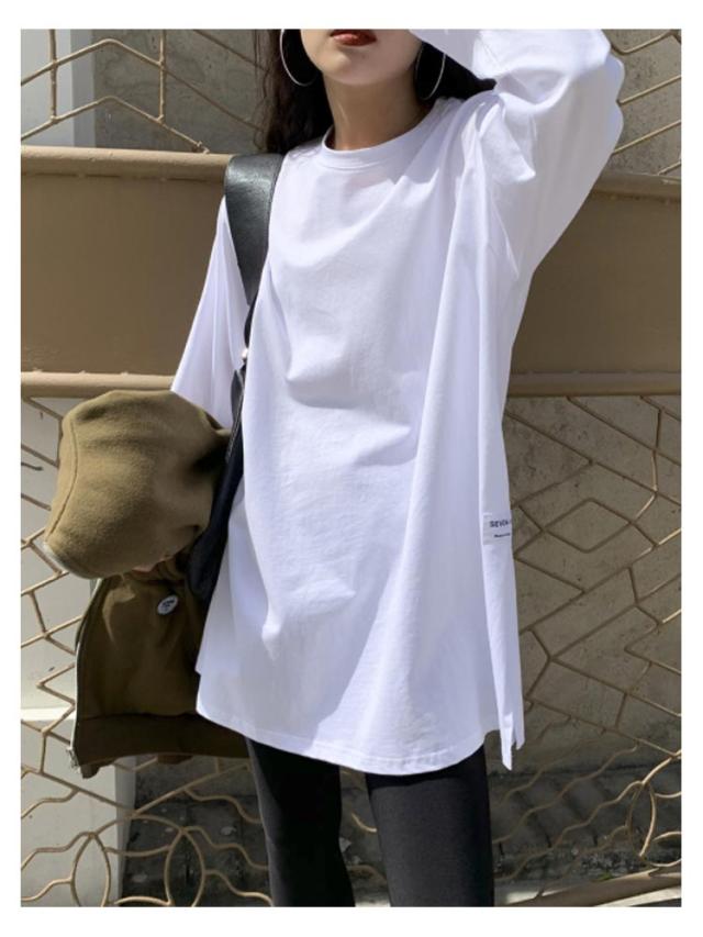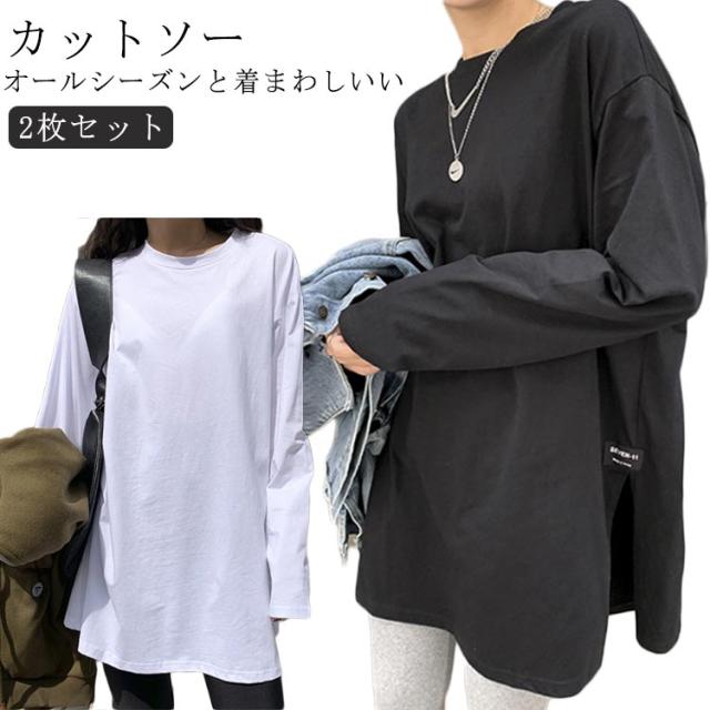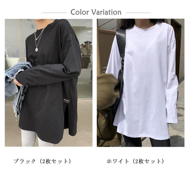 レディース 重ね着 2枚セット ゆるTシャツ 長袖 ドロップショルダー ロングTシャツ 2枚セット 長そで ロンT Tシャツ カットソー トップス クルーネック 長袖Tシャツ インナー カットソー 着痩せ ゆったり スリット 秋 冬 丸首 無地 カジュアル シンプル 白