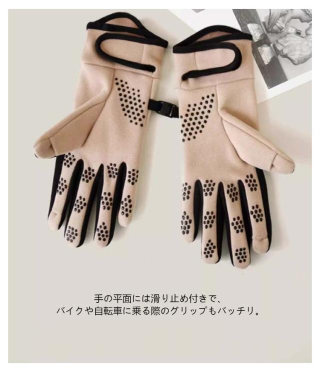 | ・防寒&防水!スマホ対応サイクルグローブ ・伸縮性のある生地、肌に優しい裏起毛で寒さ、風を防ぎます! ・手袋をつけたまま、スマートフォンのタッチパネル操作ができます。 ・手の平面には滑り止め付きで、バイクや自転車に乗る際のグリップもバッチリ。 ・ツーリング時だけでなく、ハイキングや登山などで活躍するアイテム。 ※本製品は完全防水ではありません。(甲側部撥水) | |