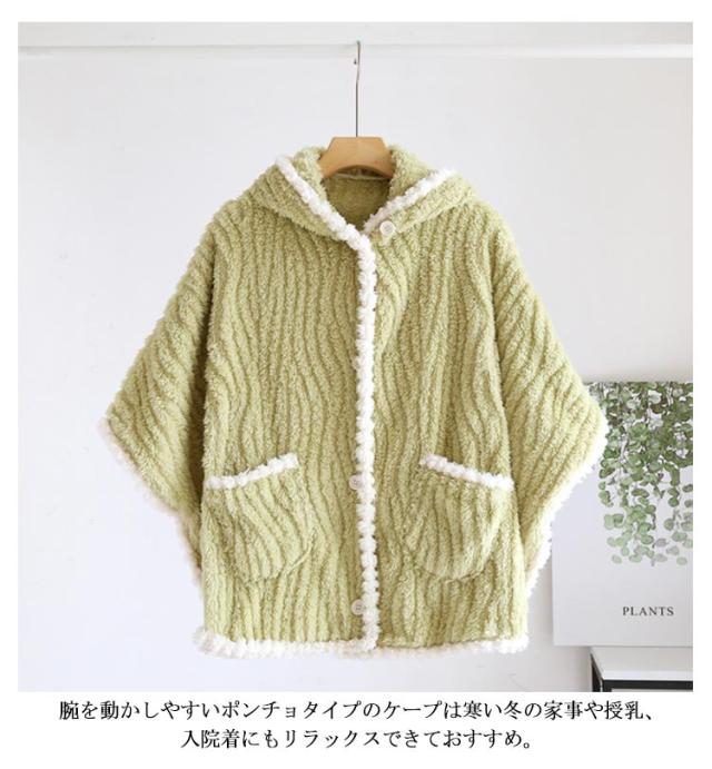 | 軽くてあったか!リラックスタイムにぴったり♪ 起毛でぽかぽか暖かい空気を逃がさず、さっと羽織るだけで暖かい。 ゆったりビッグシルエットで、軽くてサッと羽織るだけのケープは、家事やデスクワーク、趣味のくつろぎタイムにも手軽に使えて重宝。 腕を動かしやすいポンチョタイプのケープは寒い冬の家事や授乳、入院着にもリラックスできておすすめ。 ポケットは左右にあり、小物を入れたり何かと便利。 ご自宅で水洗い可能で、いつでも清潔に、とても便利。 | |