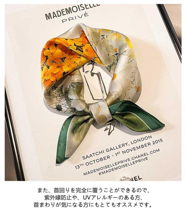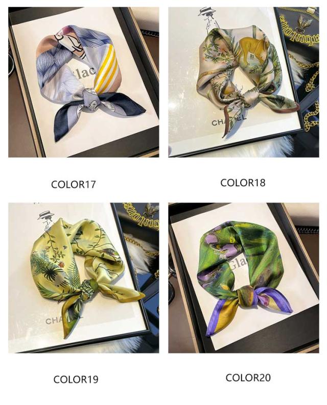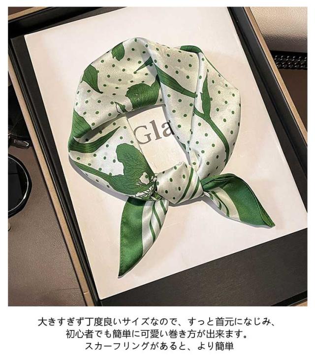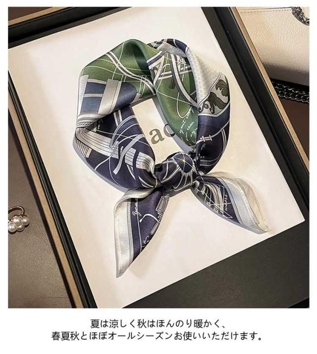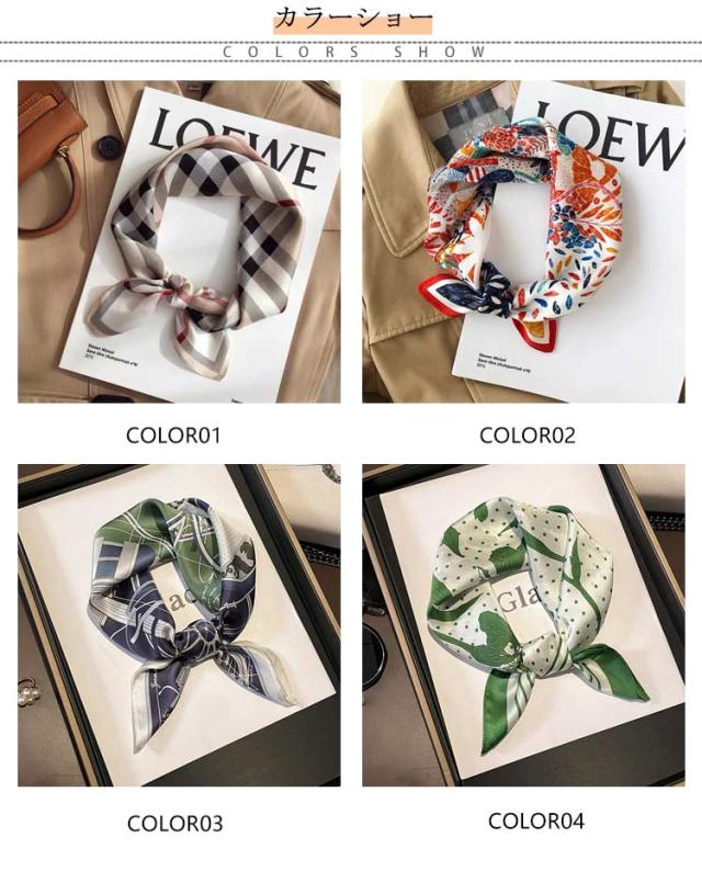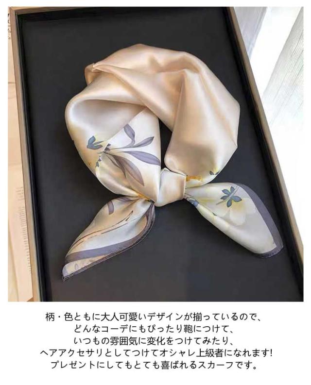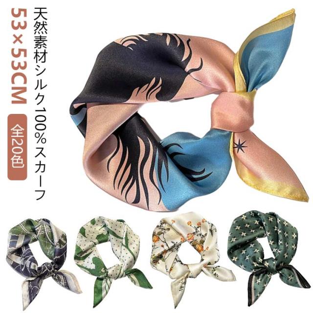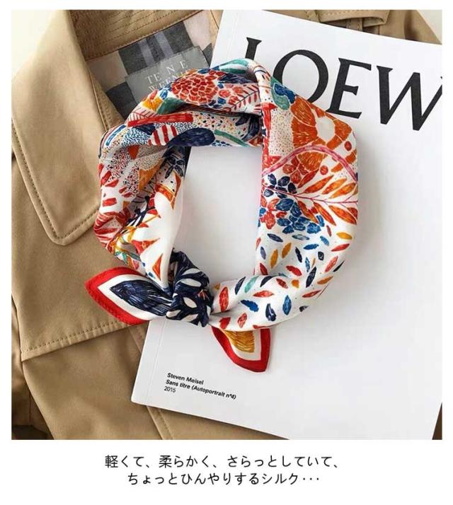 | 天然素材シルク100%スカーフ 全20色 53×53cm シルク100%の肌触りの心地よさが魅力です。 軽くて、柔らかく、さらっとしていて、ちょっとひんやりするシルク・・・ 夏は涼しく秋はほんのり暖かく、春夏秋とほぼオールシーズンお使いいただけます。 大きすぎず丁度良いサイズなので、すっと首元になじみ、初心者でも簡単に可愛い巻き方が出来ます。スカーフリングがあると、より簡単 また、首回りを完全に覆うことができるので、紫外線防止や、UVアレルギーのある方、首まわりが気になる方にもとてもオススメです。 柄・色ともに大人可愛いデザインが揃っているので、どんなコーデにもぴったり鞄につけて、いつもの雰囲気に変化をつけてみたり、ヘアアクセサリとしてつけてオシャレ上級者になれます!プレゼントにしてもとても喜ばれるスカーフです。 | |