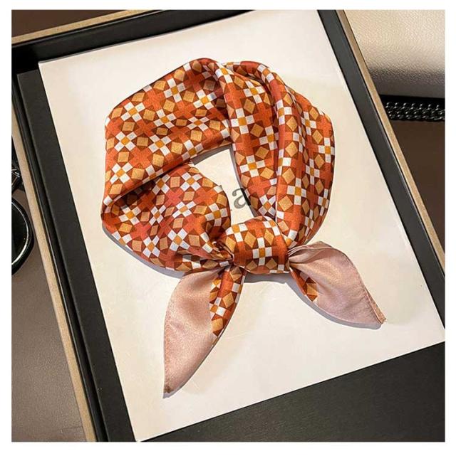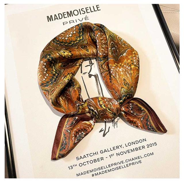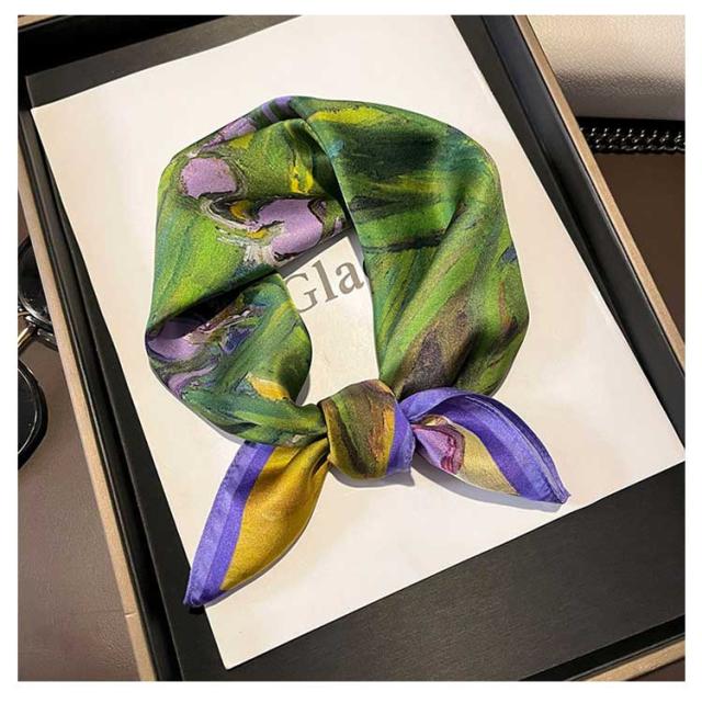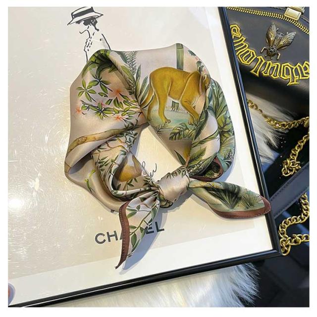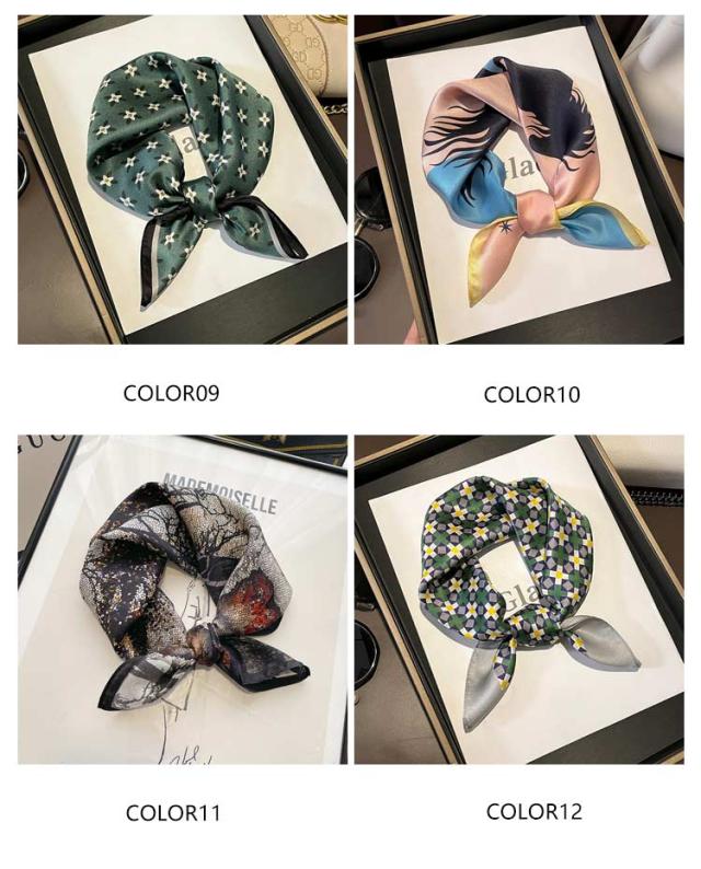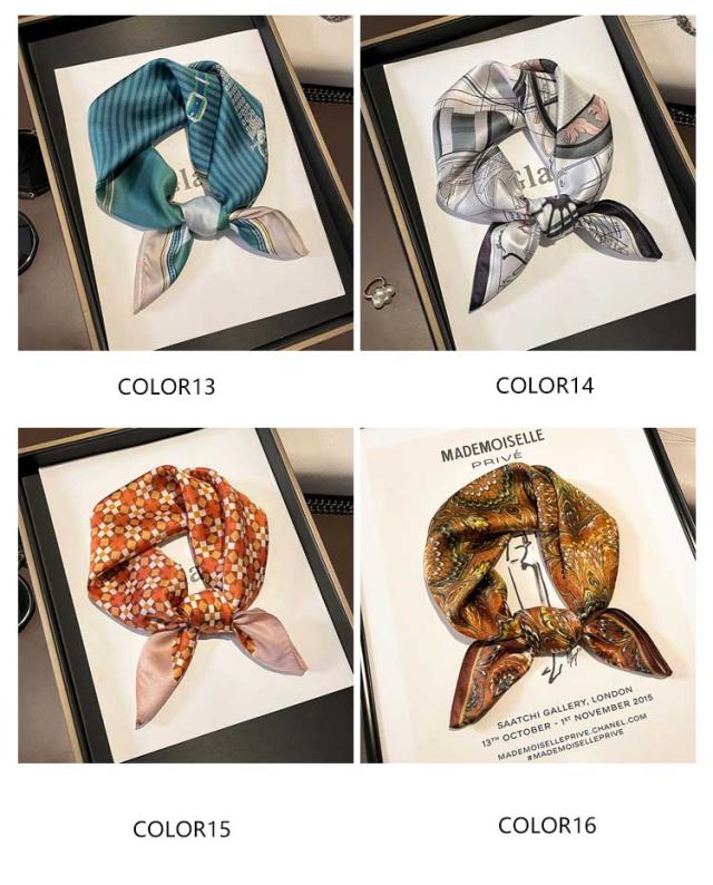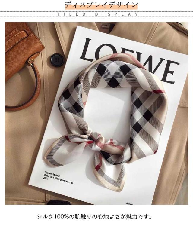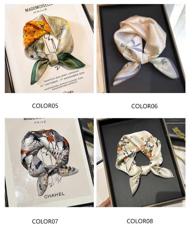 | 天然素材シルク100%スカーフ 全20色 53×53cm シルク100%の肌触りの心地よさが魅力です。 軽くて、柔らかく、さらっとしていて、ちょっとひんやりするシルク・・・ 夏は涼しく秋はほんのり暖かく、春夏秋とほぼオールシーズンお使いいただけます。 大きすぎず丁度良いサイズなので、すっと首元になじみ、初心者でも簡単に可愛い巻き方が出来ます。スカーフリングがあると、より簡単 また、首回りを完全に覆うことができるので、紫外線防止や、UVアレルギーのある方、首まわりが気になる方にもとてもオススメです。 柄・色ともに大人可愛いデザインが揃っているので、どんなコーデにもぴったり鞄につけて、いつもの雰囲気に変化をつけてみたり、ヘアアクセサリとしてつけてオシャレ上級者になれます!プレゼントにしてもとても喜ばれるスカーフです。 | |