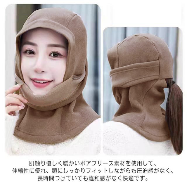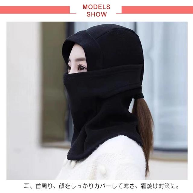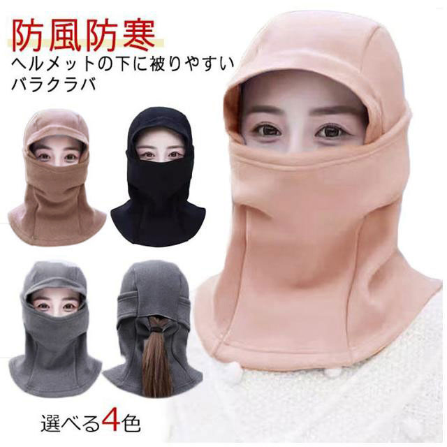 | ヘルメットの下に被りやすいバラクラバ 耳、首周り、顔をしっかりカバーして寒さ、霜焼け対策に。 ネック部分は長めの設計になっているので首を露出することなく保温出来ます。 目の周りにはしっかり空間を設け、サングラスやメガネも着用しやすくなっています。 後ろは穴付きで、髪を結んだままでも着用できるのが嬉しいポイント。 レディースもメンズも使いやすい目出し帽。 肌触り優しく暖かいボアフリース素材を使用して、伸縮性に優れ、頭にしっかりフィットしながらも圧迫感がなく、長時間つけていても違和感がなく快適です。 自転車やバイクの通学・通勤はもちろん、サイクリング・バイクツーリング・スキー・スノーボード・スノーモービル・ランニング・登山・トレッキング・キャンプ・釣りなど寒い季節のお出かけやアウトドアに重宝する間違いなしのヘルメットインナーキャップです。 | |