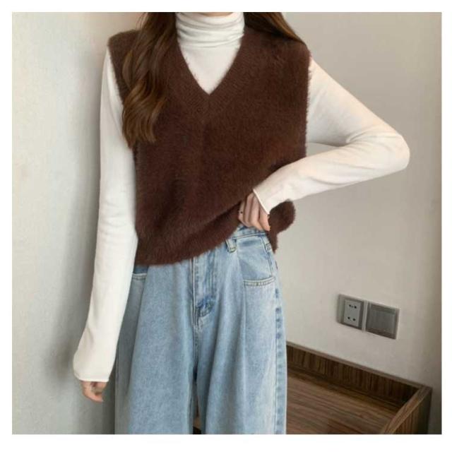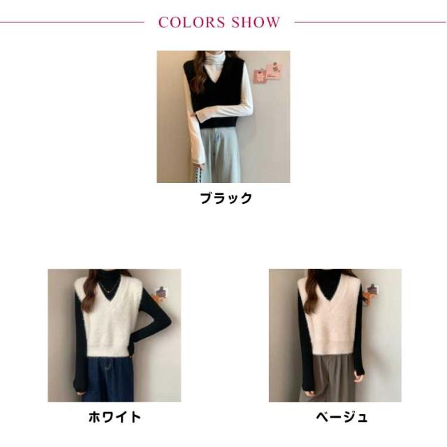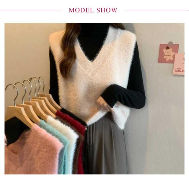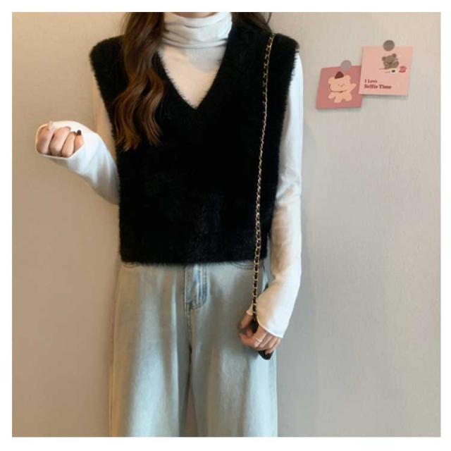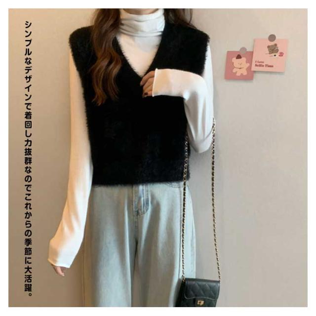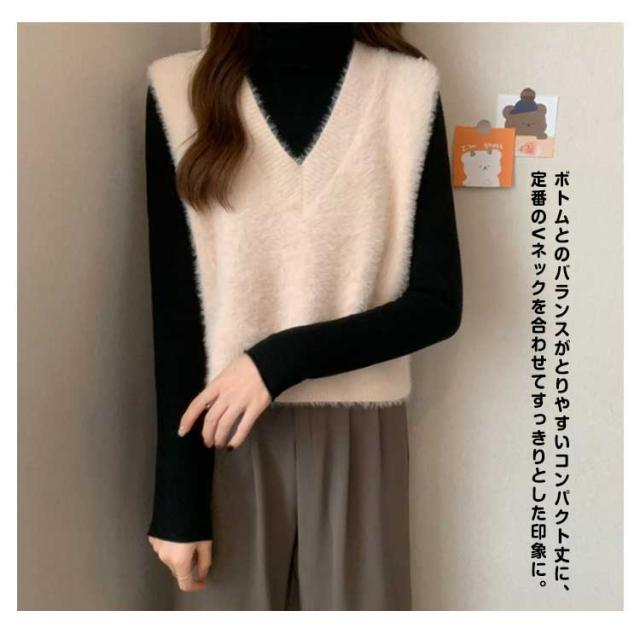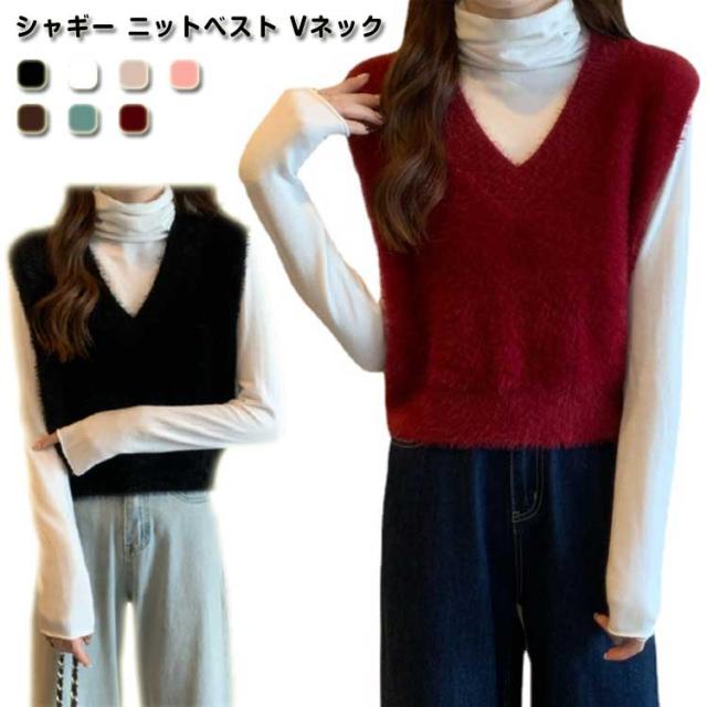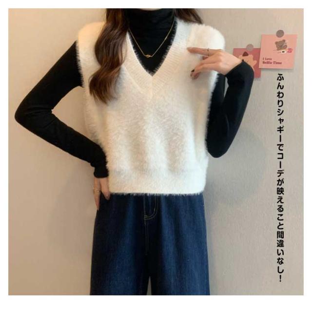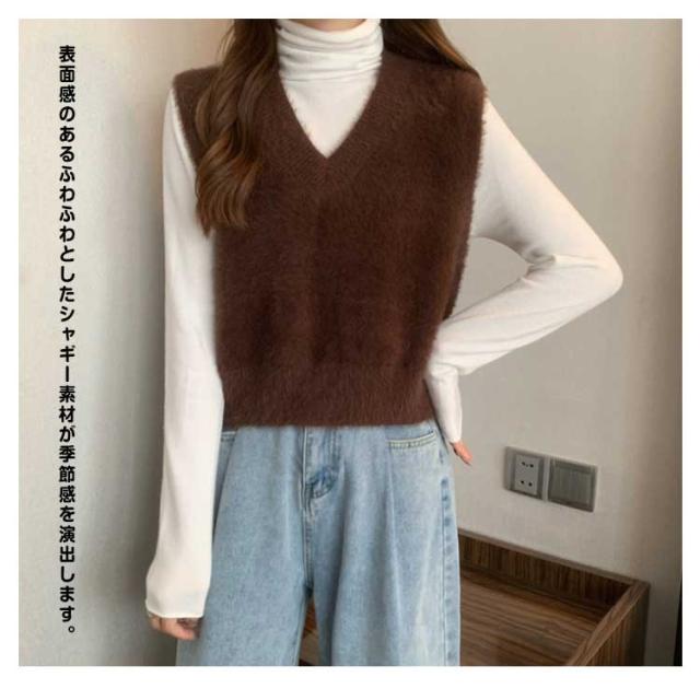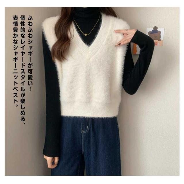 プルオーバー ニットベスト 秋冬 コンパクト ショート丈 ふわふわ シャギーニットベスト ベスト あったか シャギーニットベスト ベスト Vネック もこもこ 厚手 シャギートップス ニットトップス 大人可愛い レイヤード 重ね着 おしゃれ 20代 30代 40代 50代 無地 シンプル