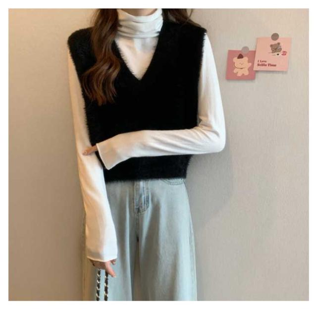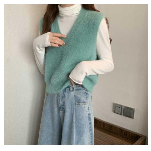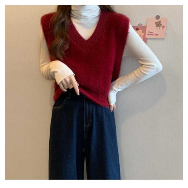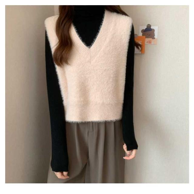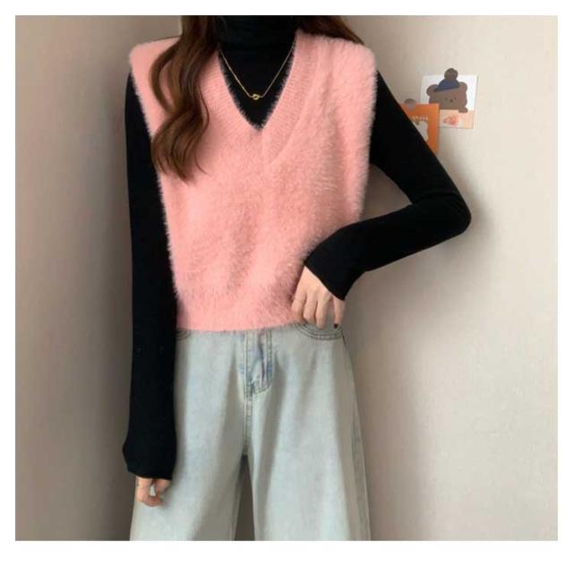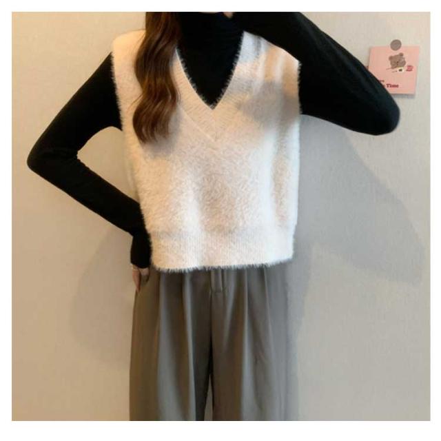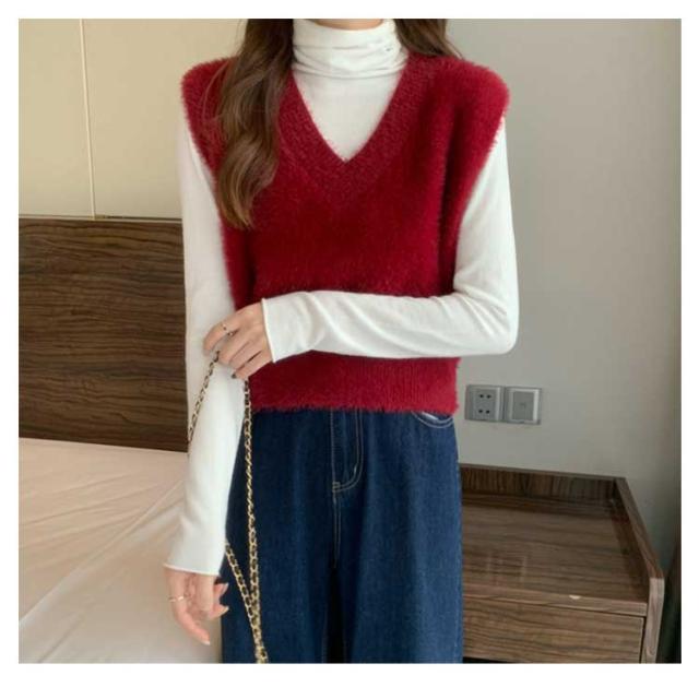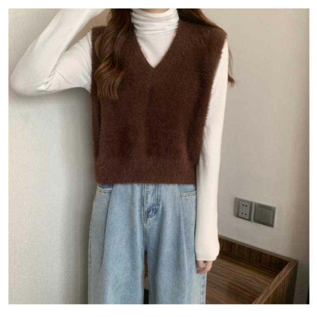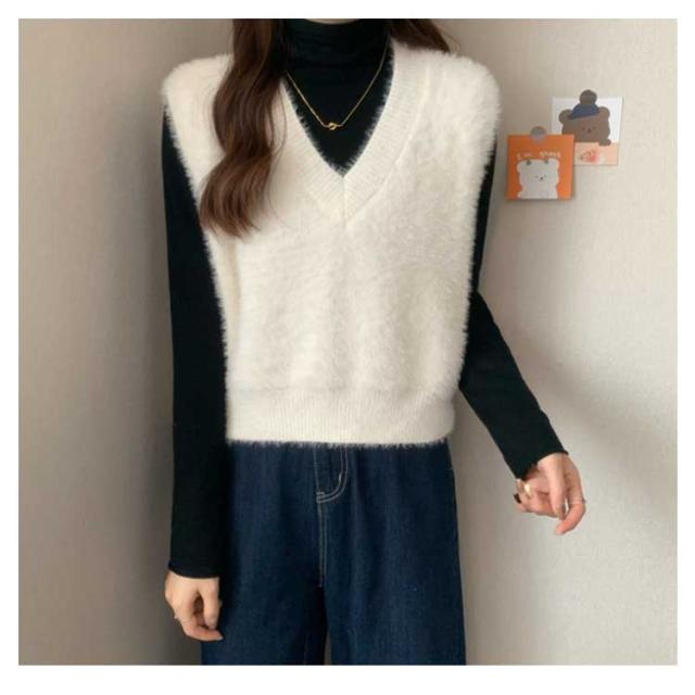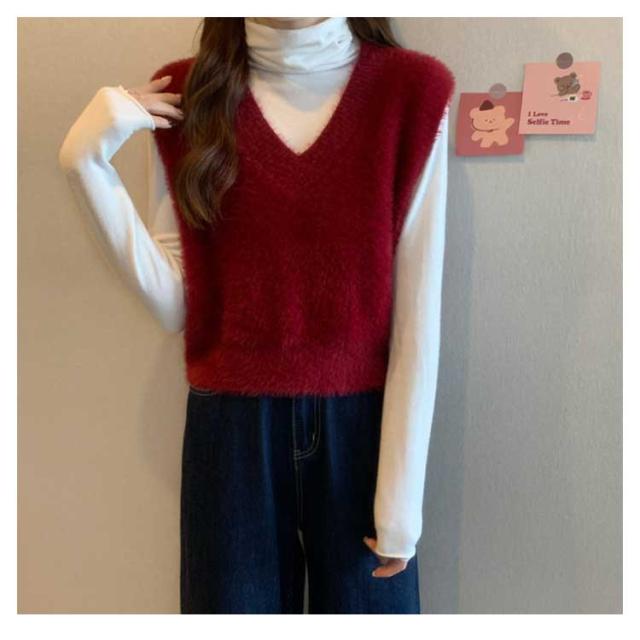 プルオーバー ニットベスト 秋冬 コンパクト ショート丈 ふわふわ シャギーニットベスト ベスト あったか シャギーニットベスト ベスト Vネック もこもこ 厚手 シャギートップス ニットトップス 大人可愛い レイヤード 重ね着 おしゃれ 20代 30代 40代 50代 無地 シンプル