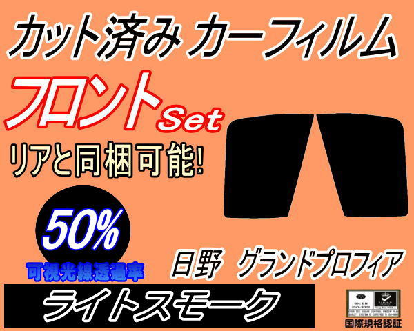 【送料無料】フロント (b) 日野 グランドプロフィア (50%) カット済みカーフィルム 運転席 助手席 三角窓 左右セット スモークフィルム フロントドア 車種別 スモーク 車種専用 成形 フイルム 日よけ 窓 ガラス ウインドウ 紫外線 UVカット ダンプ トラック