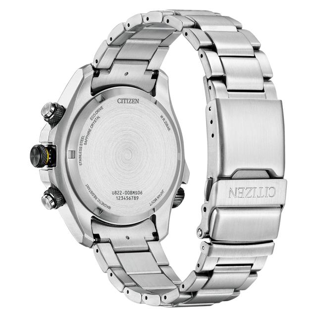 | 機能 | 充電量表示機能 充電警告機能 過充電防止機能 パワーセーブ機能 ライトレベル インディケーター フル充電時約3年可動(パワーセーブ作動時) パーペチュアルカレンダー LED デイ&デイト表示 24時間表示 12/24時間表示切替機能 1/100秒クロノグラフ(40時間計) ワールドタイム機能(43時差) 協定世界時(UTC)表示 サマータイム機能 時差設定機能 ローカルタイム機能 衝撃検知機能 アラーム タイマー |