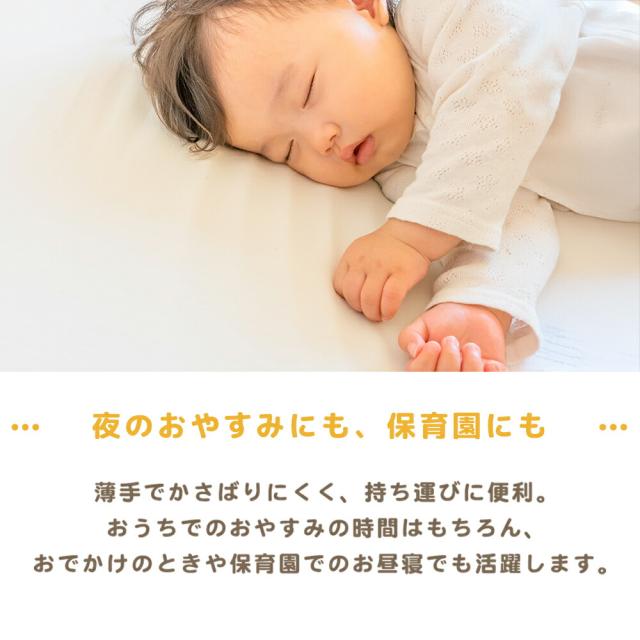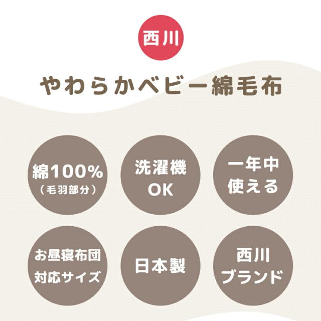 | ・素肌にやさしい綿100%(毛羽部分) 吸水性・吸湿性に優れた天然素材の 綿(コットン)を使用しているので、肌に優しい。 お肌が敏感で汗かきな赤ちゃんが安心できる素材です。 ・洗濯機で洗える汗をかいても、汚しても、気軽に洗えるのが嬉しいポイント。 洗濯ネットに入れて洗濯機でじゃぶじゃぶ洗えます。 ・夜のおやすみにも、保育園にも薄手でかさばりにくく、持ち運びに便利。 おうちでのおやすみの時間はもちろん、 おでかけのときや保育園でのお昼寝でも活躍します。 ・西川製品西川株式会社は、1566年創業の日本有数の寝具メーカー。450年以上の長い歴史がある老舗です。よい睡眠を追求するために、これまでに培った伝統や技術を活かし、また最新の技術を取り入れながら新しい商品を創造しています。眠りや寝具に対するこだわりは強く、そのこだわりの強さが品質の高さに繋がっています。 | |